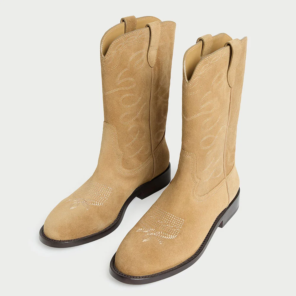 Tan Embroidered Round Toe Slip On Mid Calf Cowgirl Boots for Women