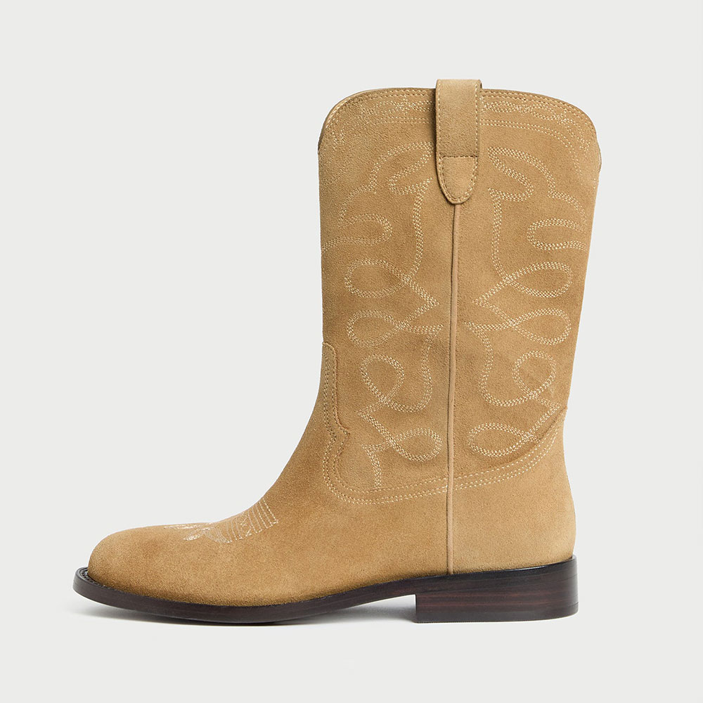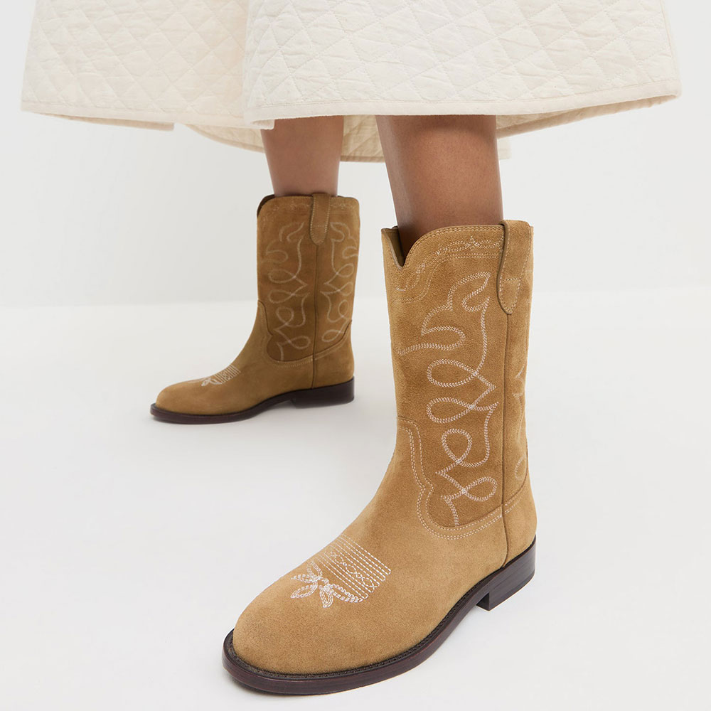 • Special Designs: The cowgirl boots have a closed toe, a slip-on, embroidery, and a mid-calf design.