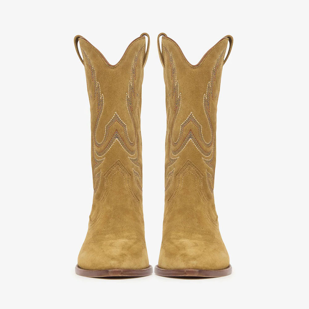Special Designs: The tan vegan suede cowboy boots feature intricate embroidered patterns, a pointed toe, and a chunky heel.