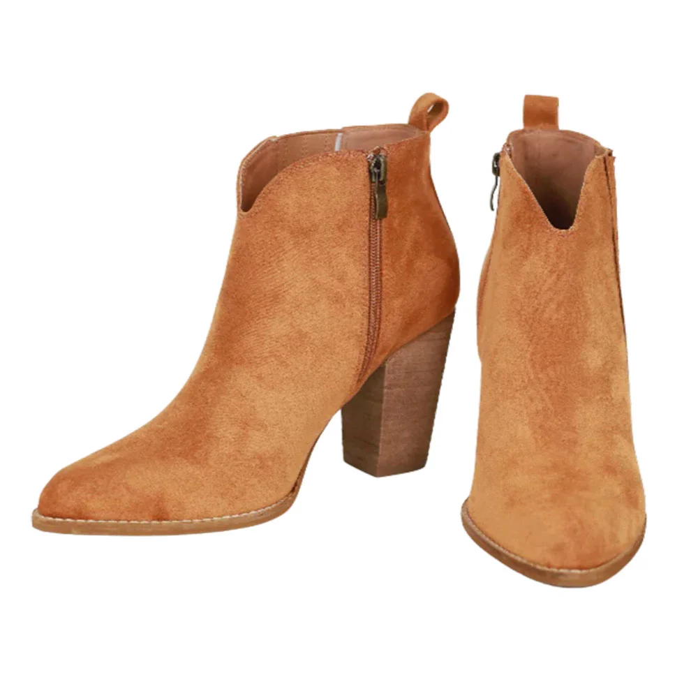 Tan Pointed Toe Chunky Heel Side Zipper Women's Western Boots