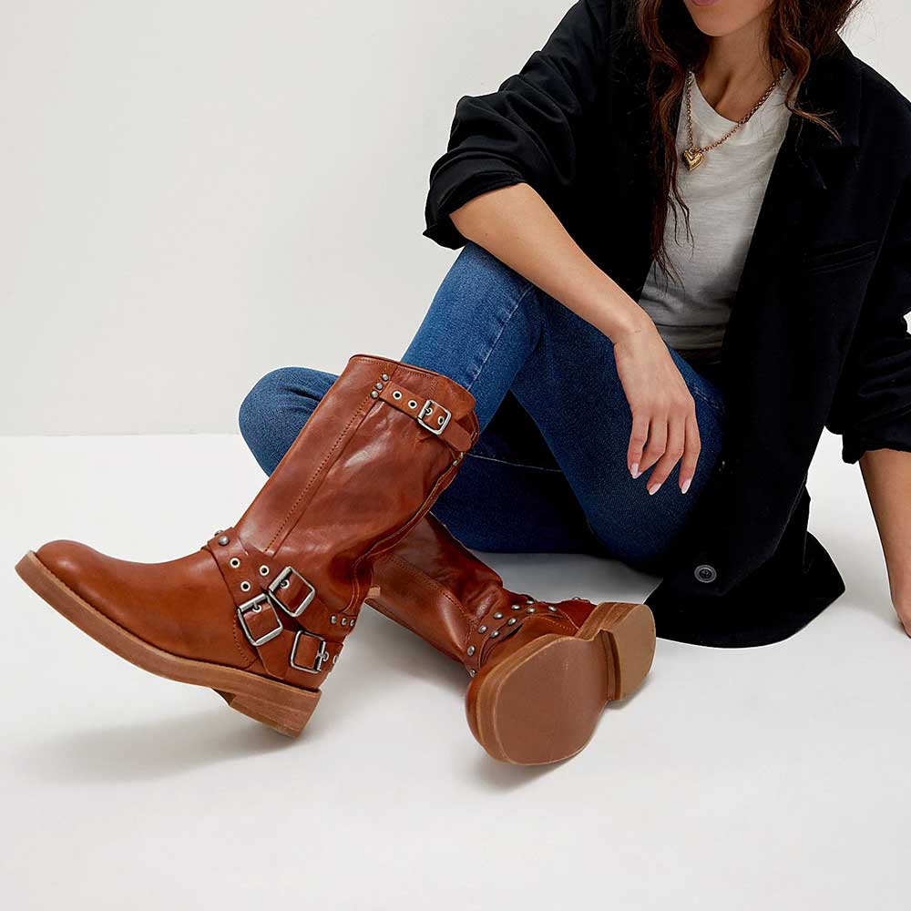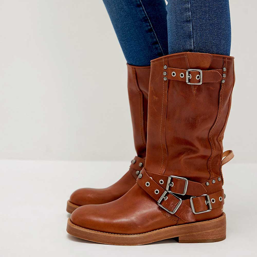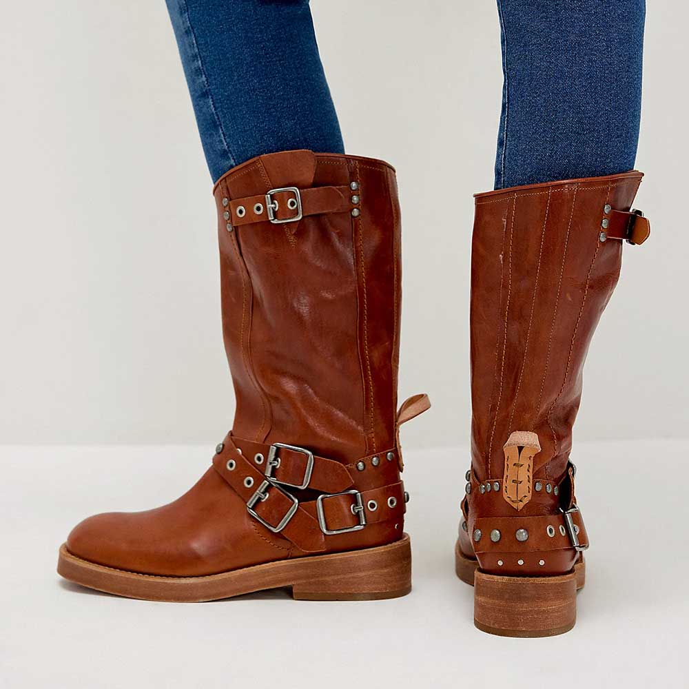 Special Designs: The tan faux leather motorcycle boots are mid-calf length and feature grommet buckle accents at the topline and vamp, along with studded detailing.