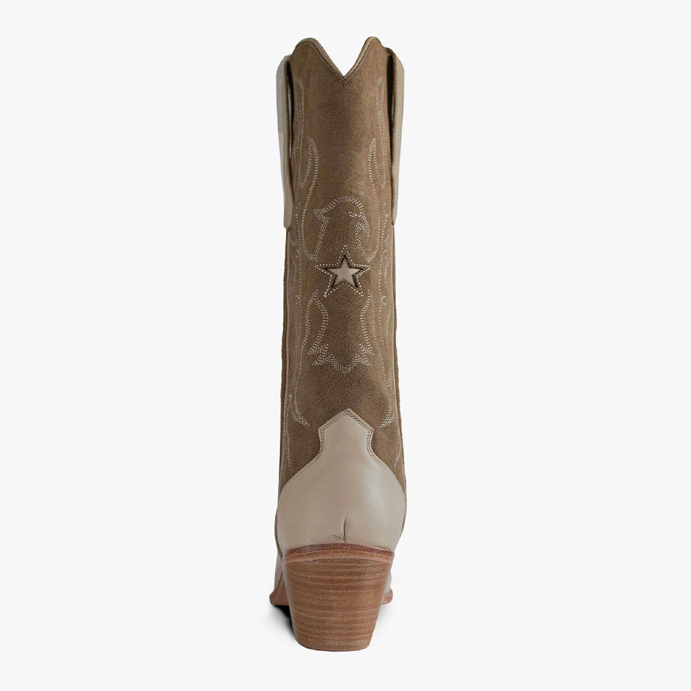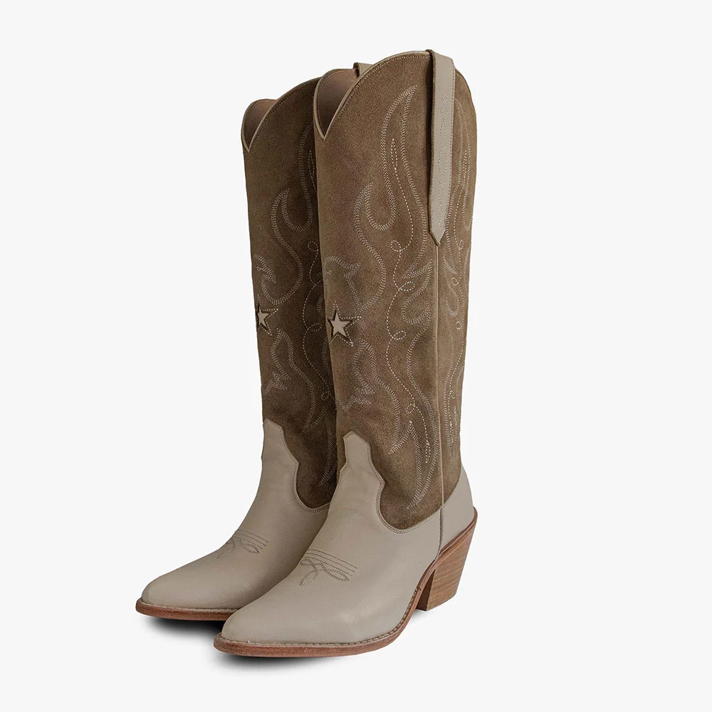 Taupe Block Heel Embroidered Knee High Snip Toe Cowboy Boots for Women