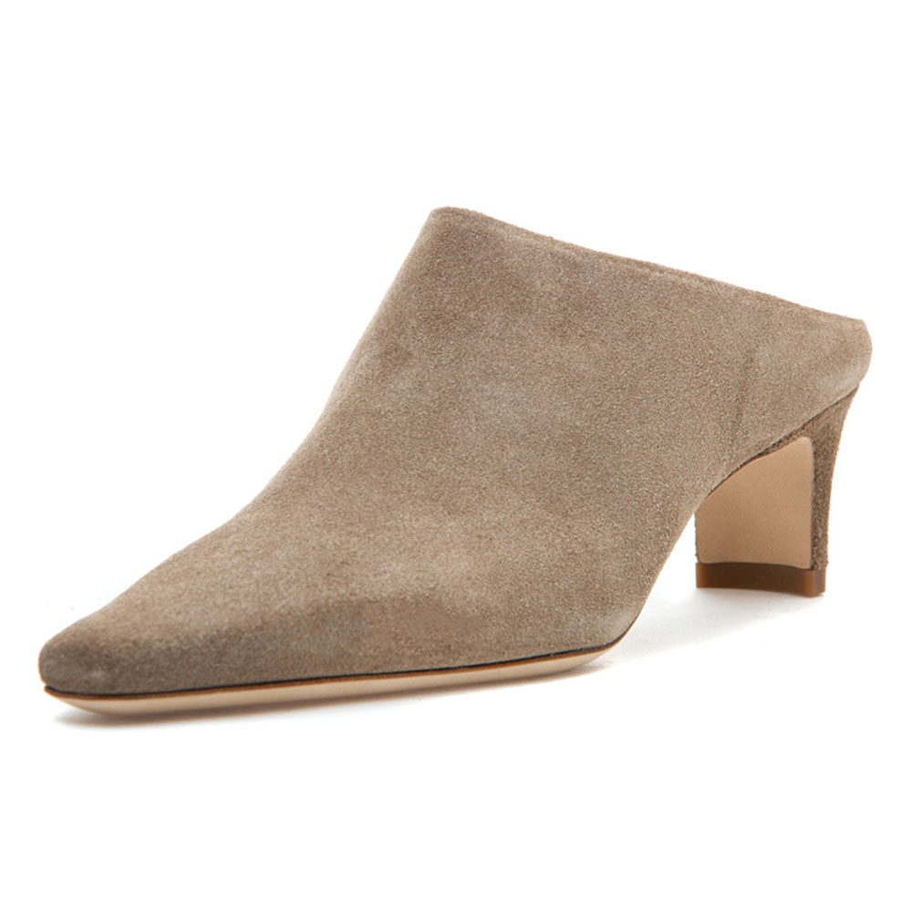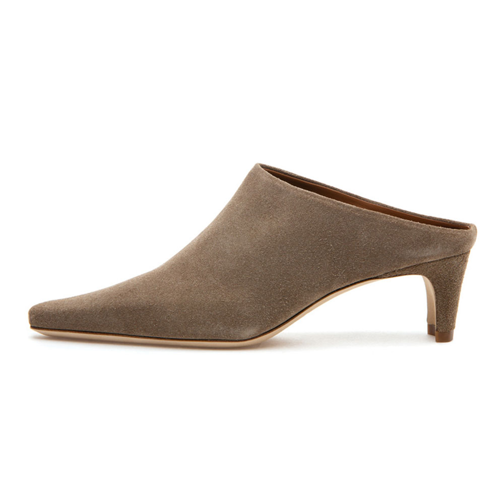 Special Designs: The taupe vegan suede square-toe mules feature a sleek, minimalist, and slip-on design and a comfortable chunky heel.