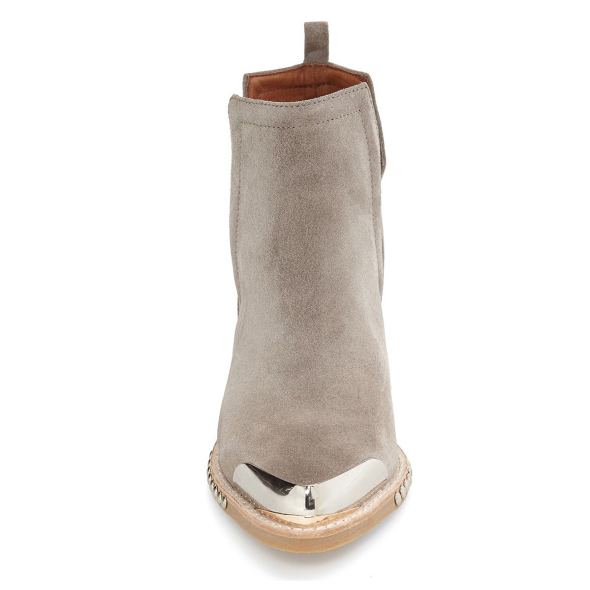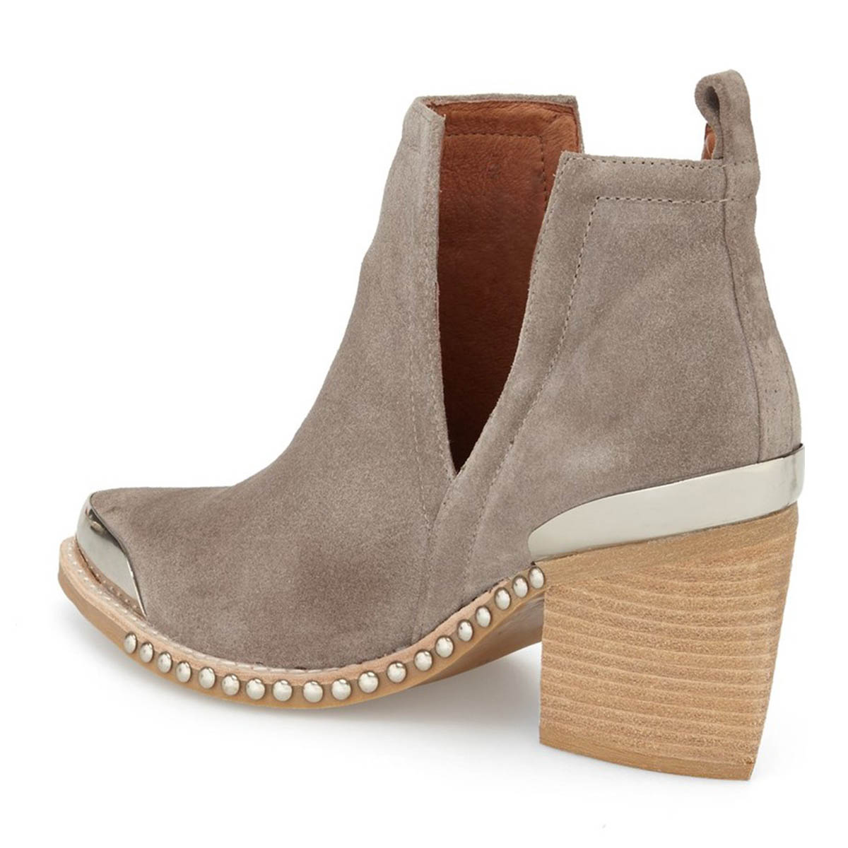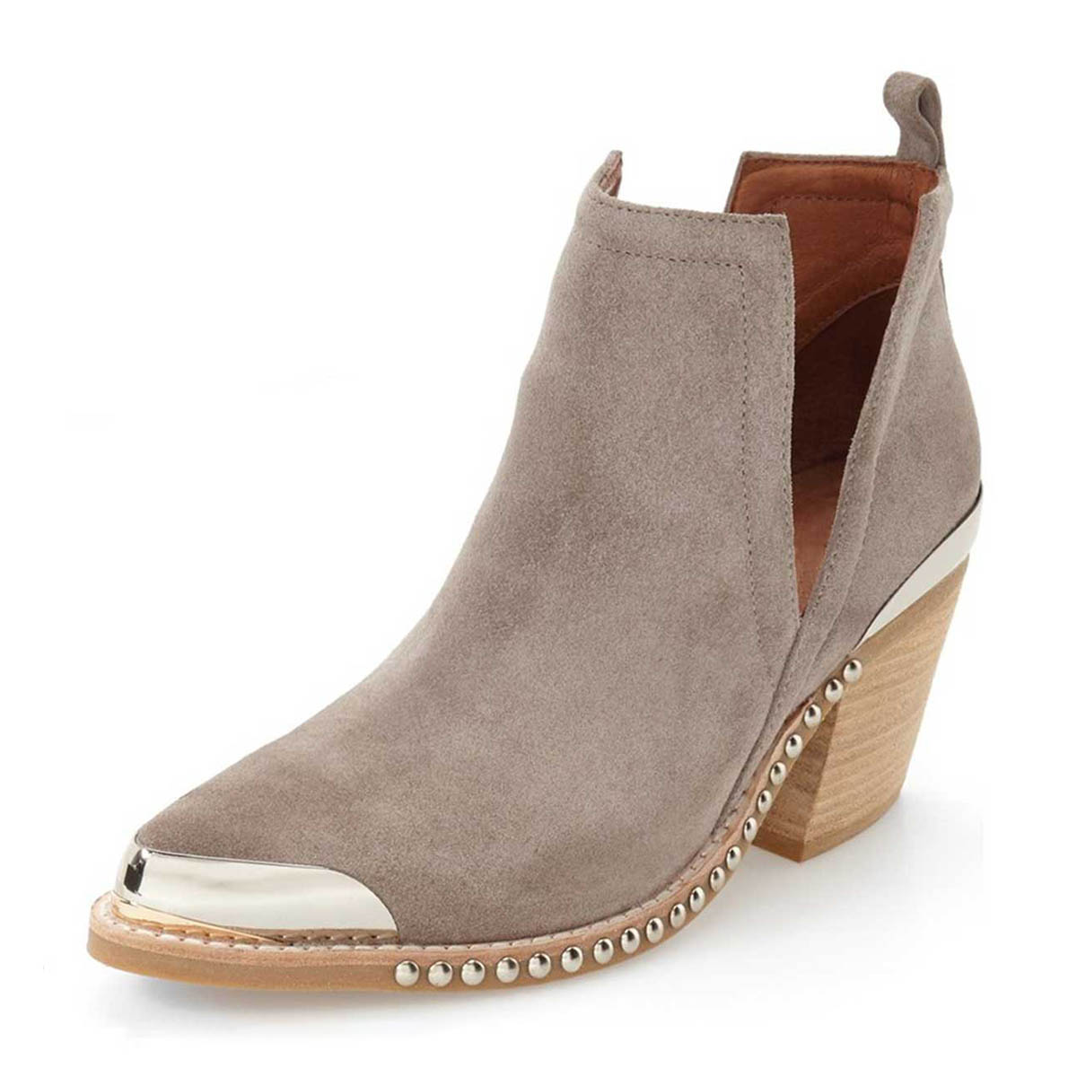 Taupe Vegan Suede Cut Out Pointed Toe Chunky Heel Ankle Boots with Metal