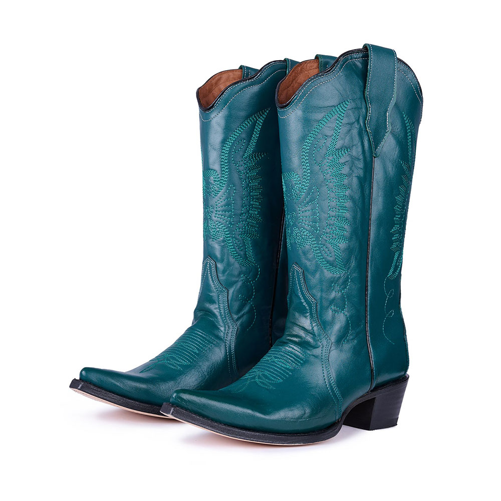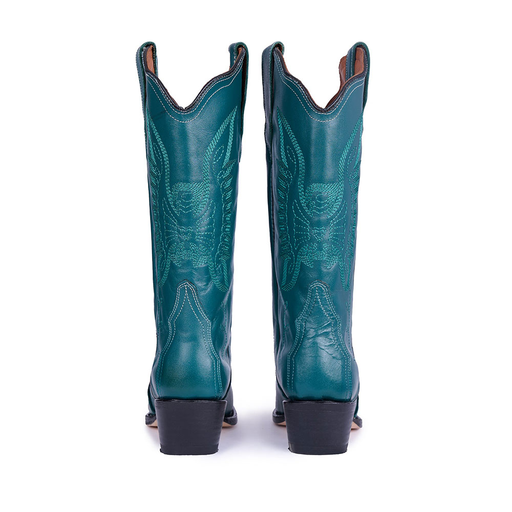 Teal Chunky Heel Pointed Toe Cowgirl Boots with Eagle Embroidery