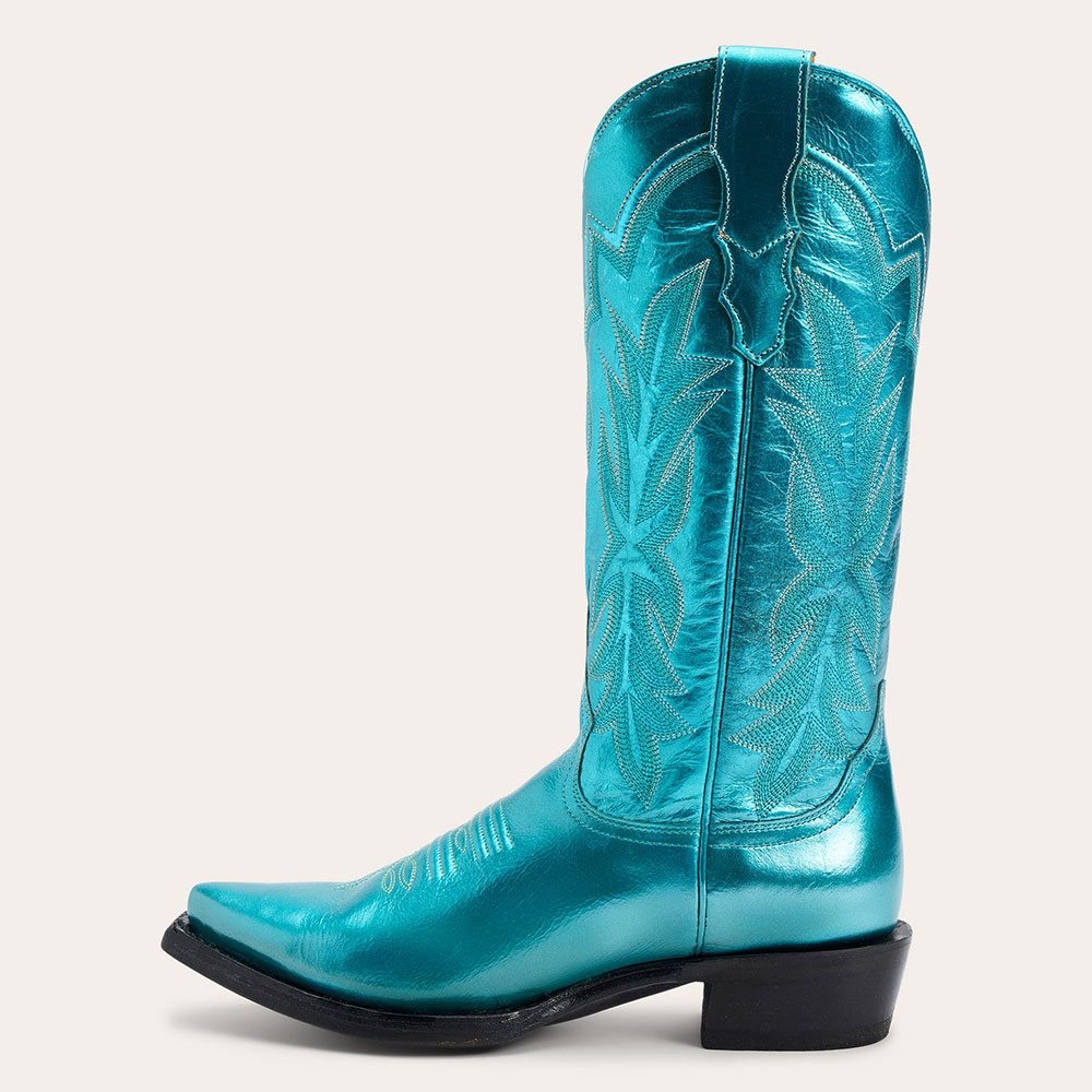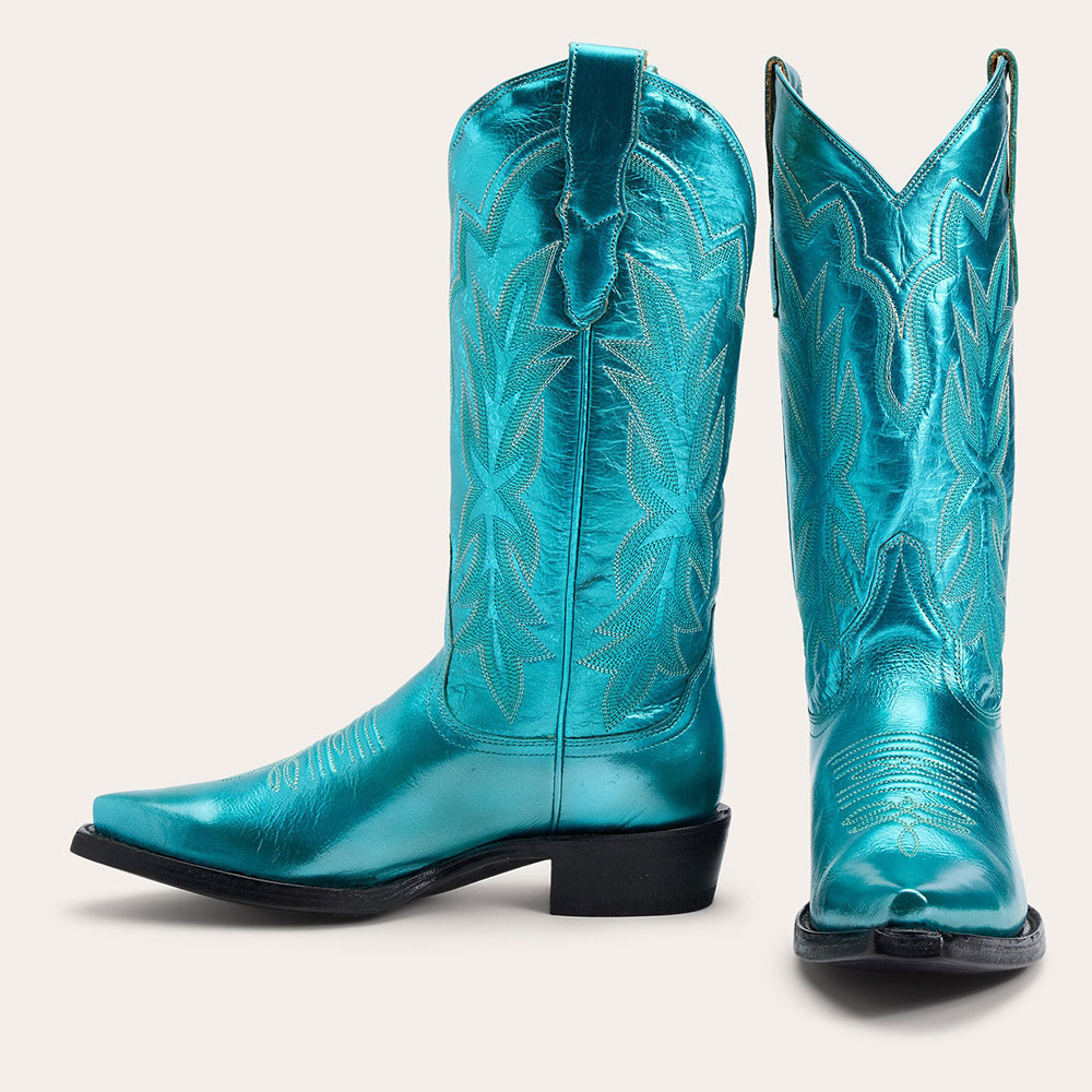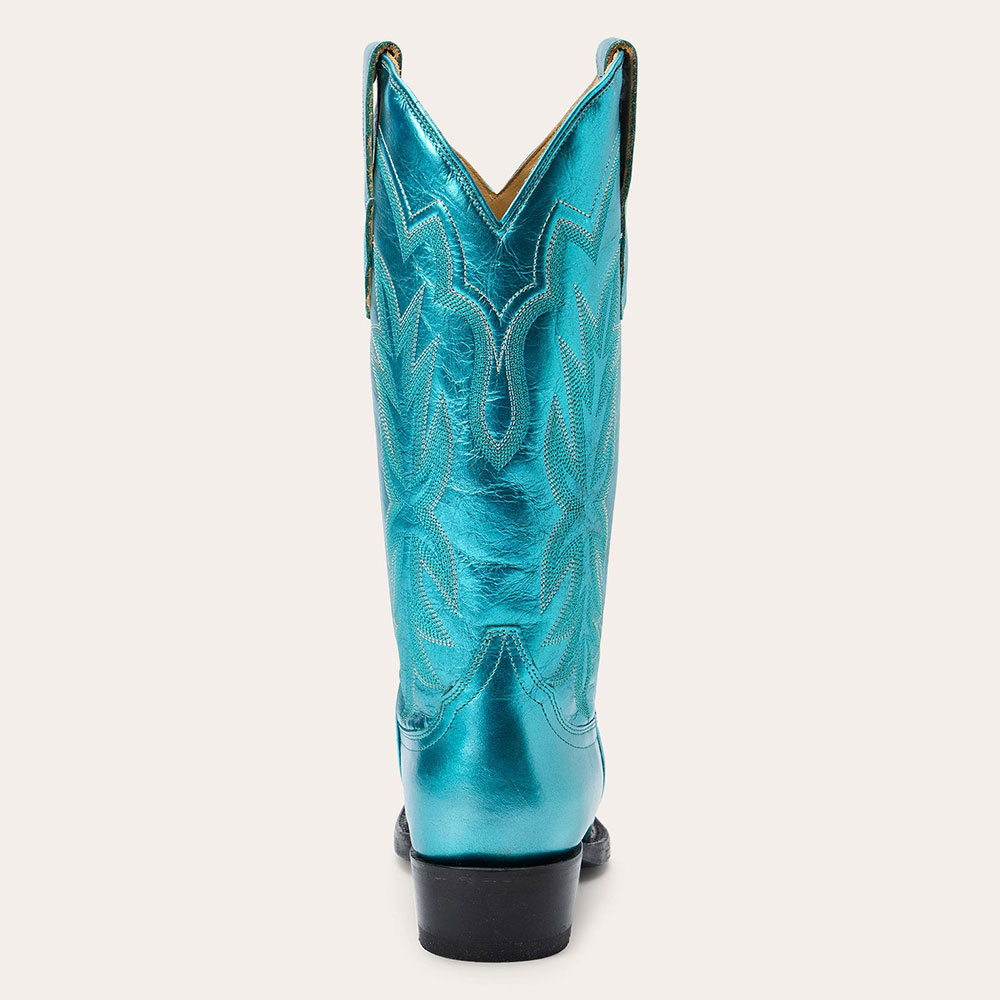 Teal Metallic Finish Chunky Heel Cowgirl Boots with Embroidery