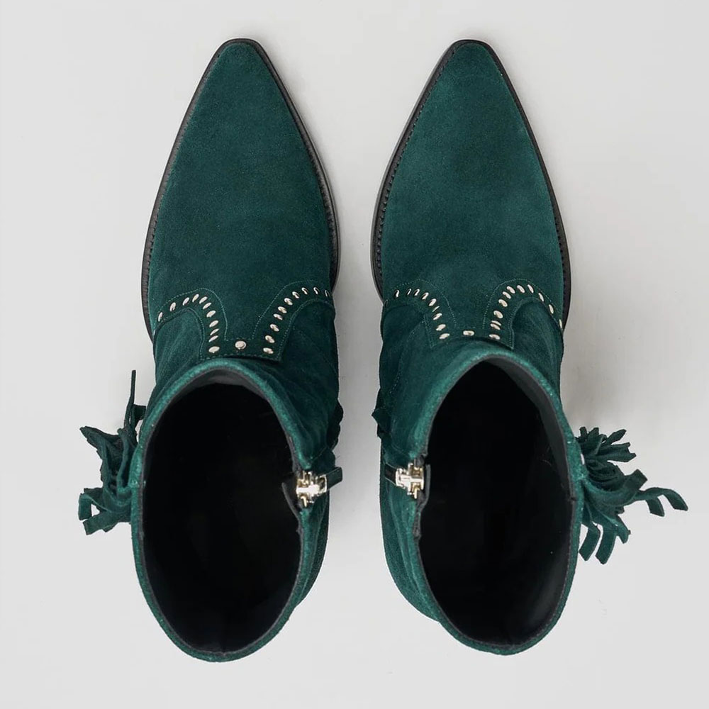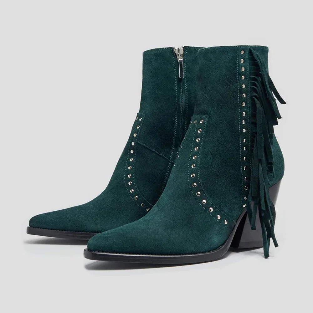 Teal Pointed Toe Block High Heel Studded Fringe Ankle Boots