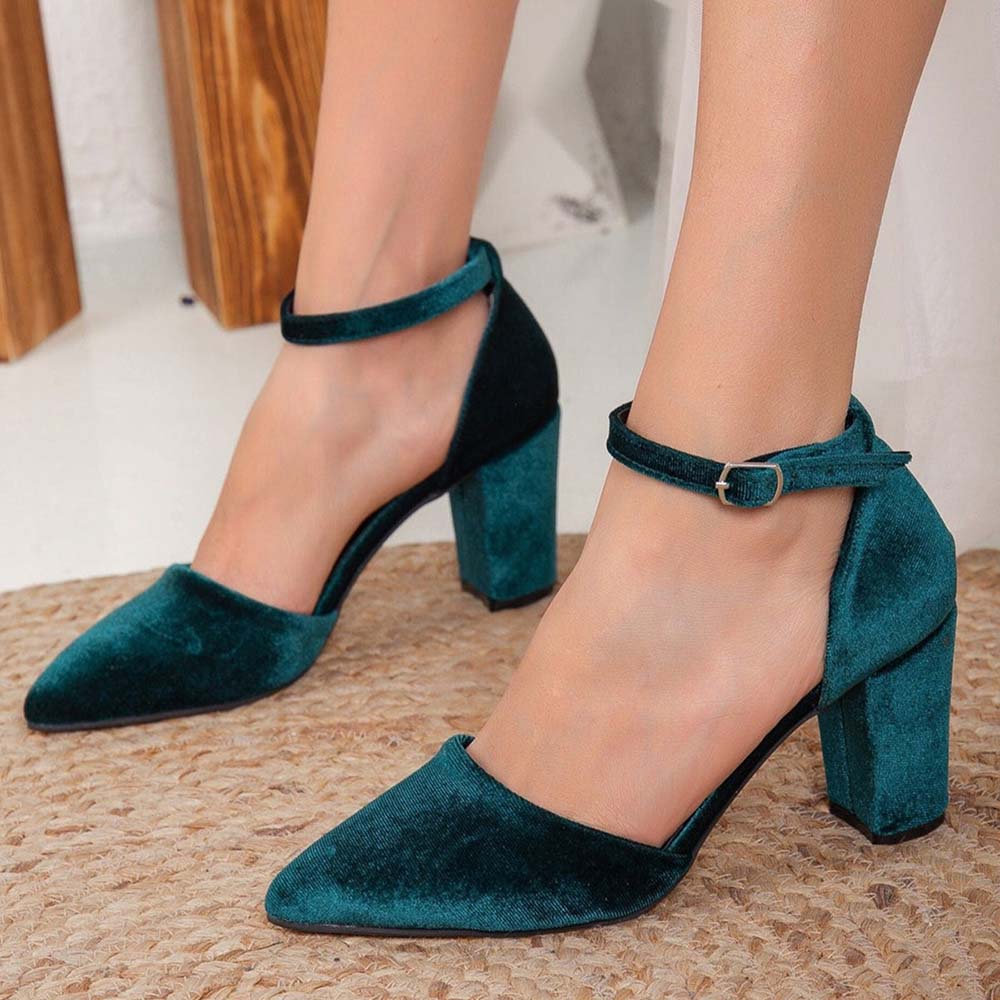 Teal Velvet Pointed Toe Ankle Strap Elegant Block Heel Pumps