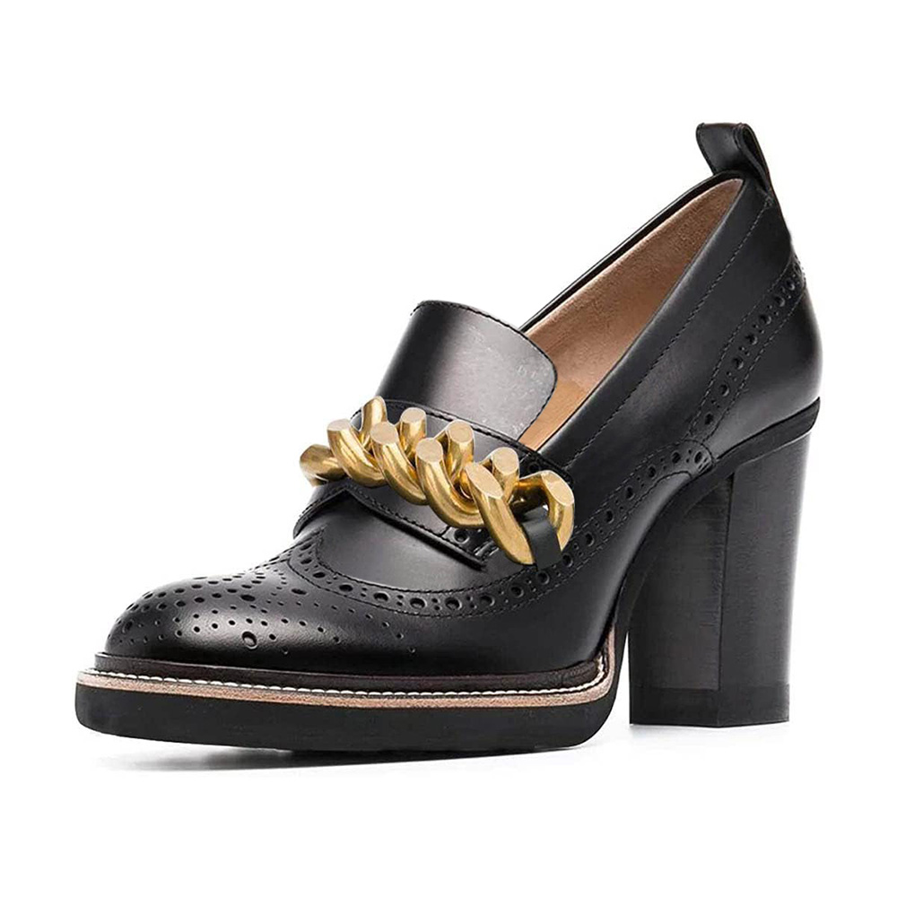 Special Designs: The round-toe loafer heels feature chunky heels, chain, and a Brogue-style design.