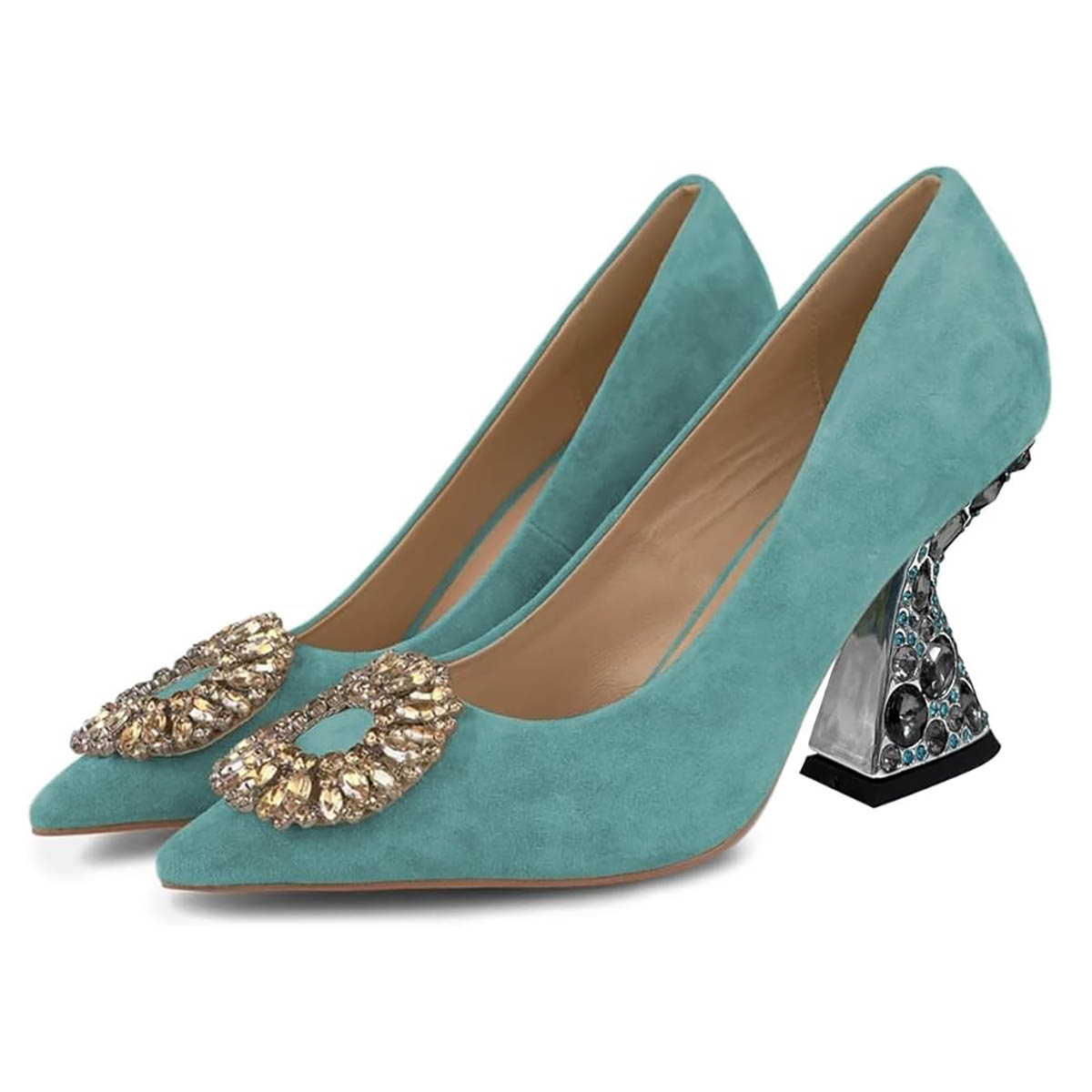 Turquoise Faux Suede Floral Rhinestone Embellished Pumps for Ladies
