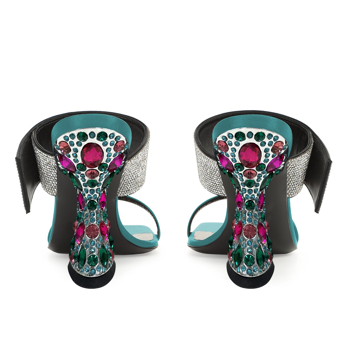 Turquoise Satin Rhinestone Embellished Mules with Sculptural Heel