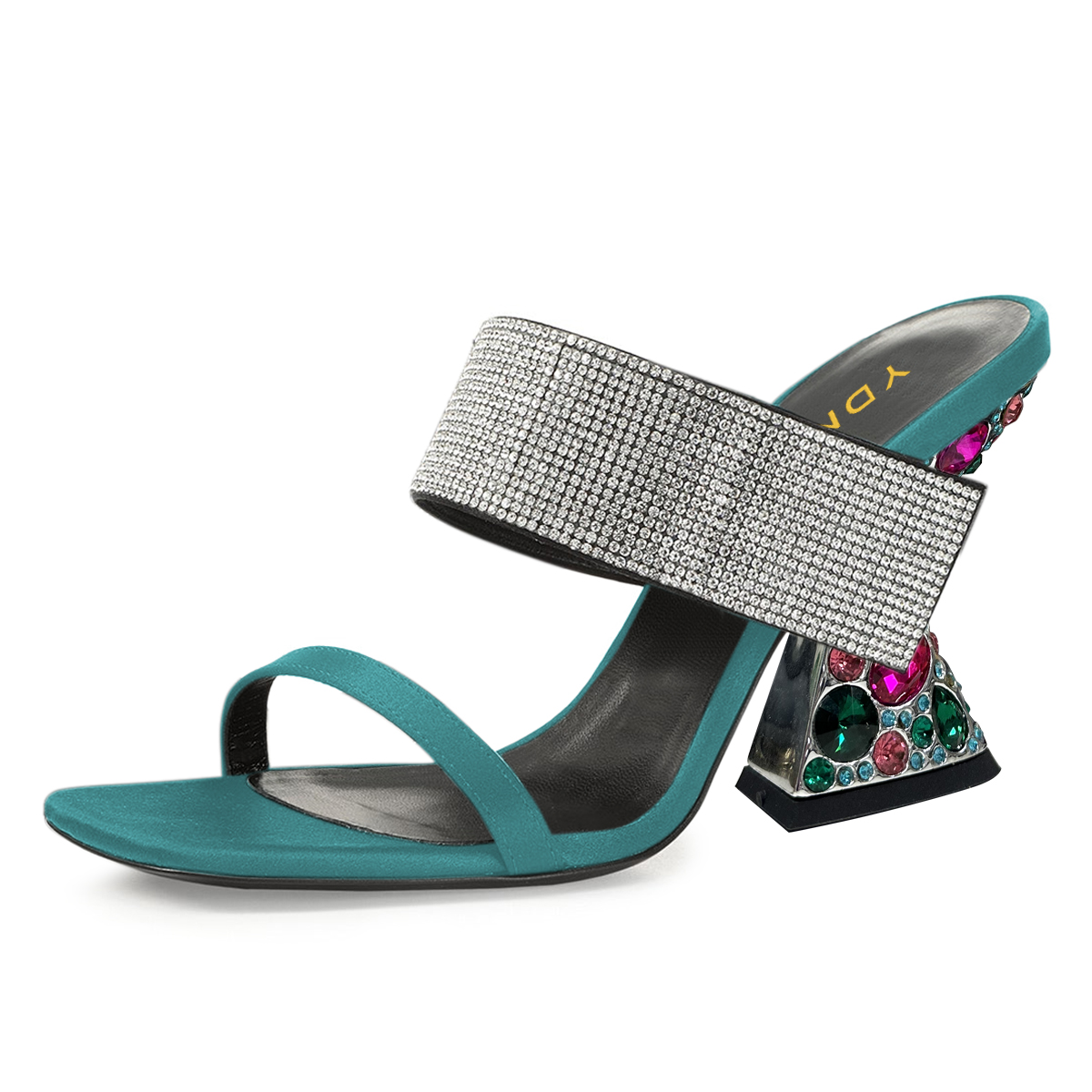 Special Designs: Turquoise mules feature rhinestone embellished band and a colorful elegant high heel.