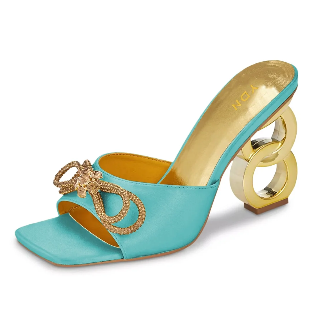 Turquoise Square Toe Heeled Rhinestone Bow Wide Strap Summer Sandals