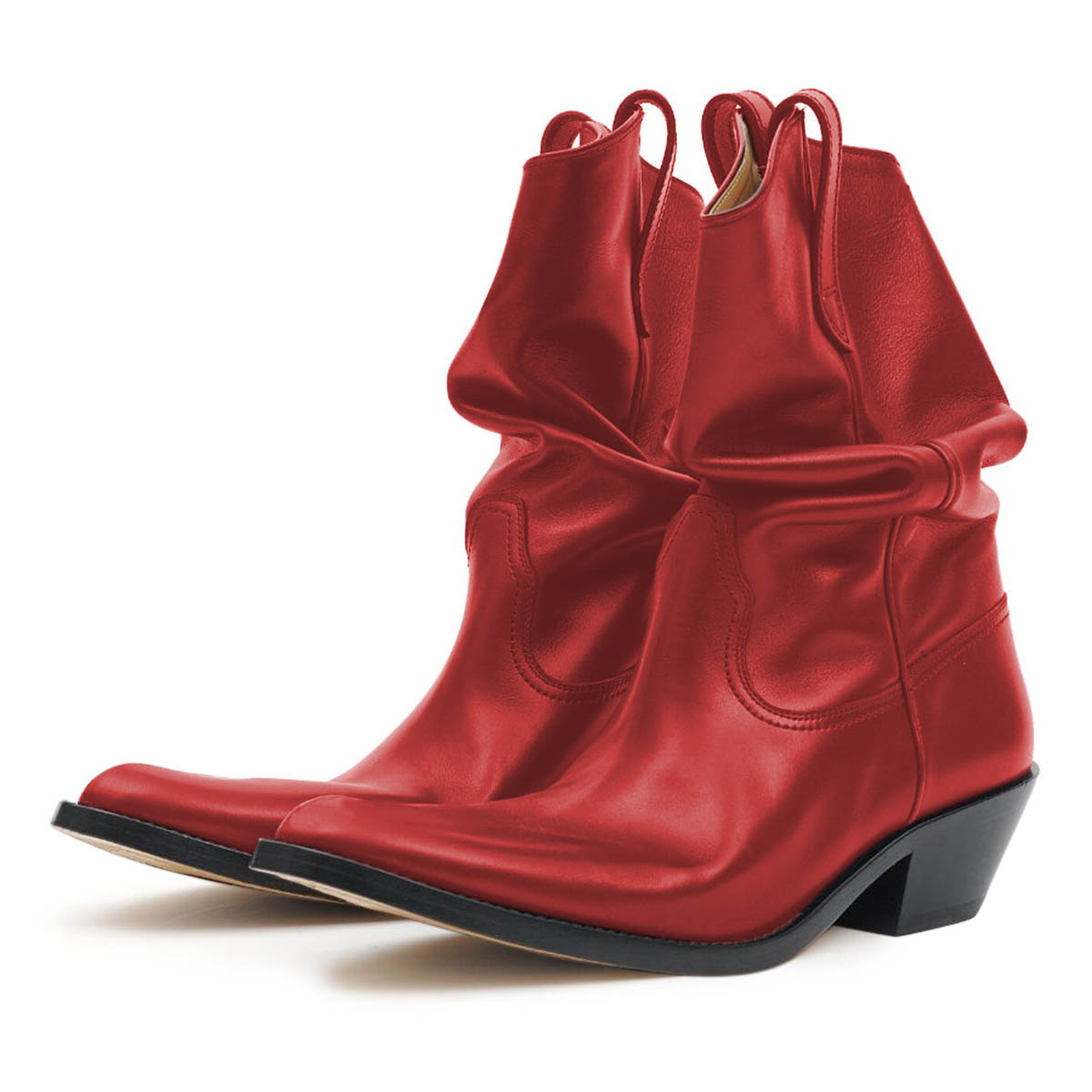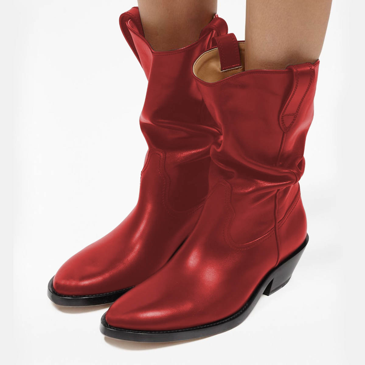 • Special Designs: Red shiny boots featuring classic side loops and a low block heel