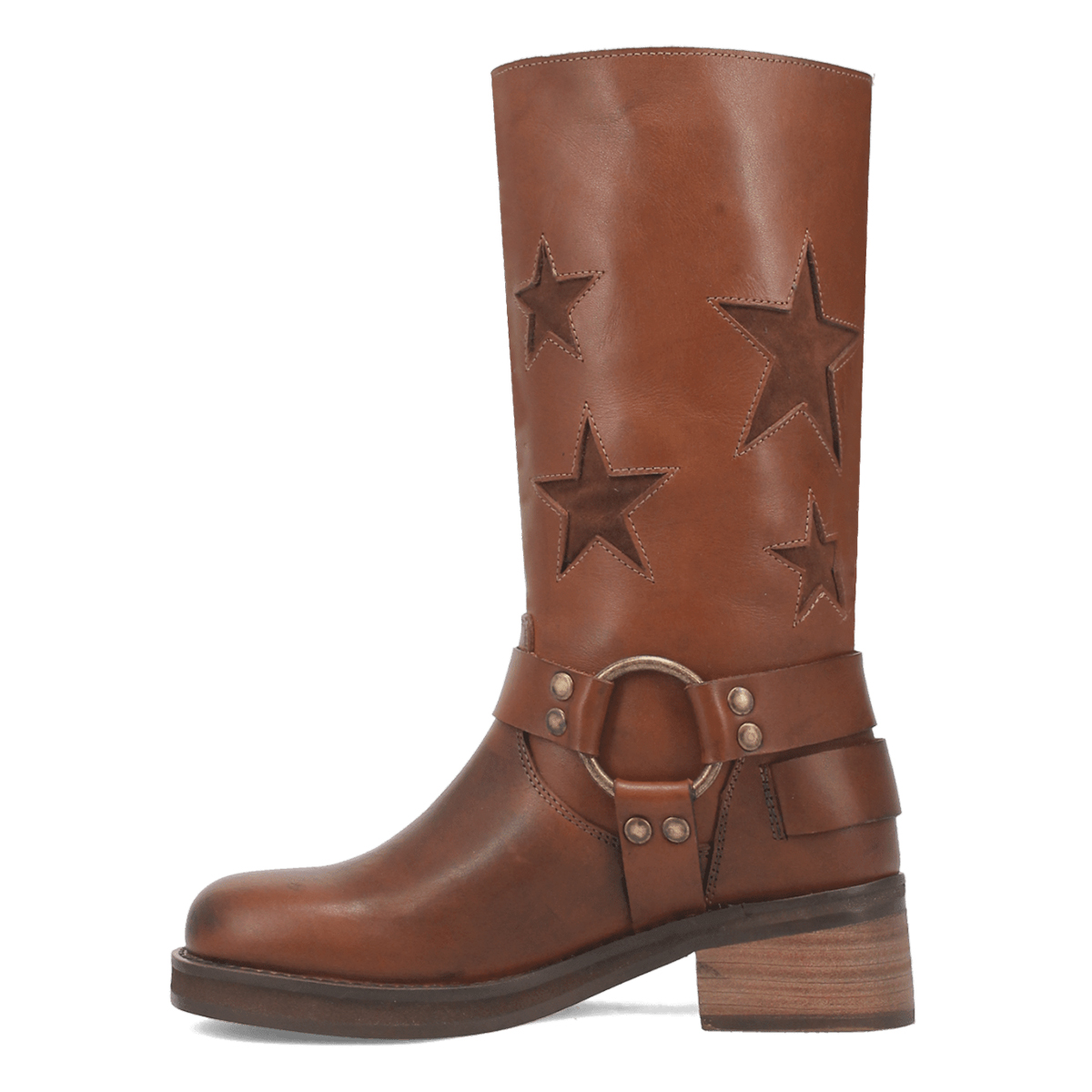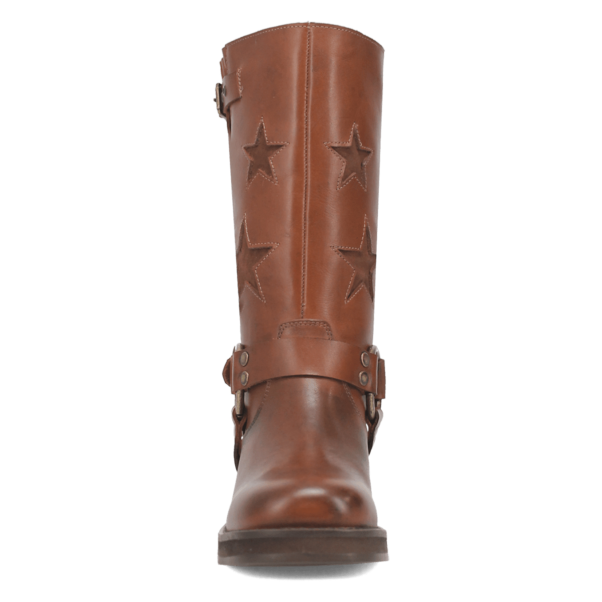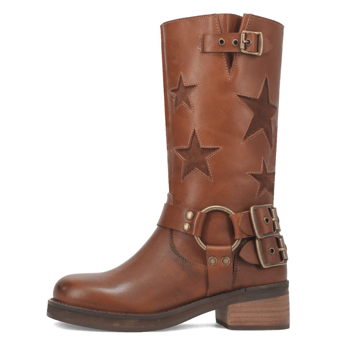 Vegan Leather Brown Star Inlay Studded Buckle Strap Block Heel Boots