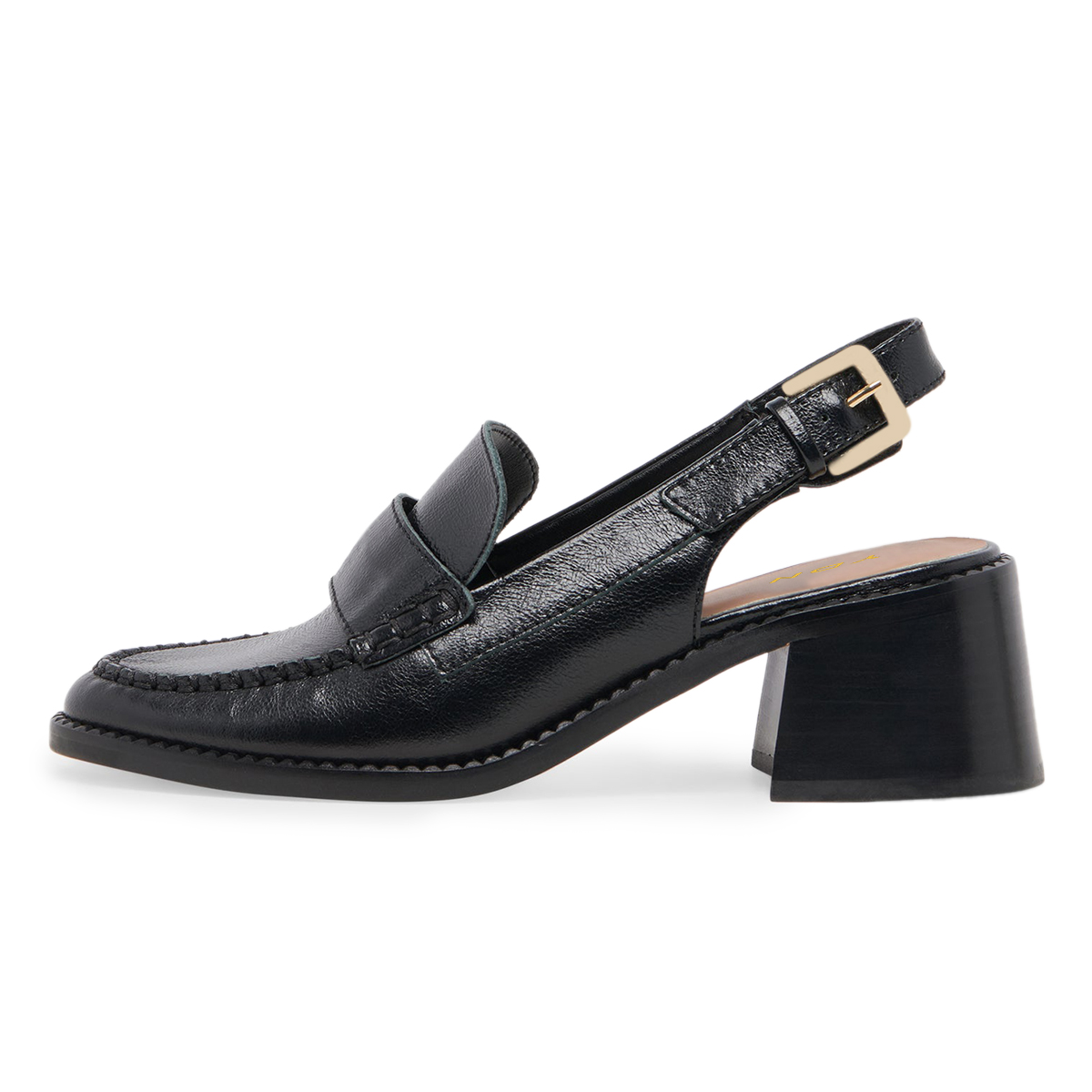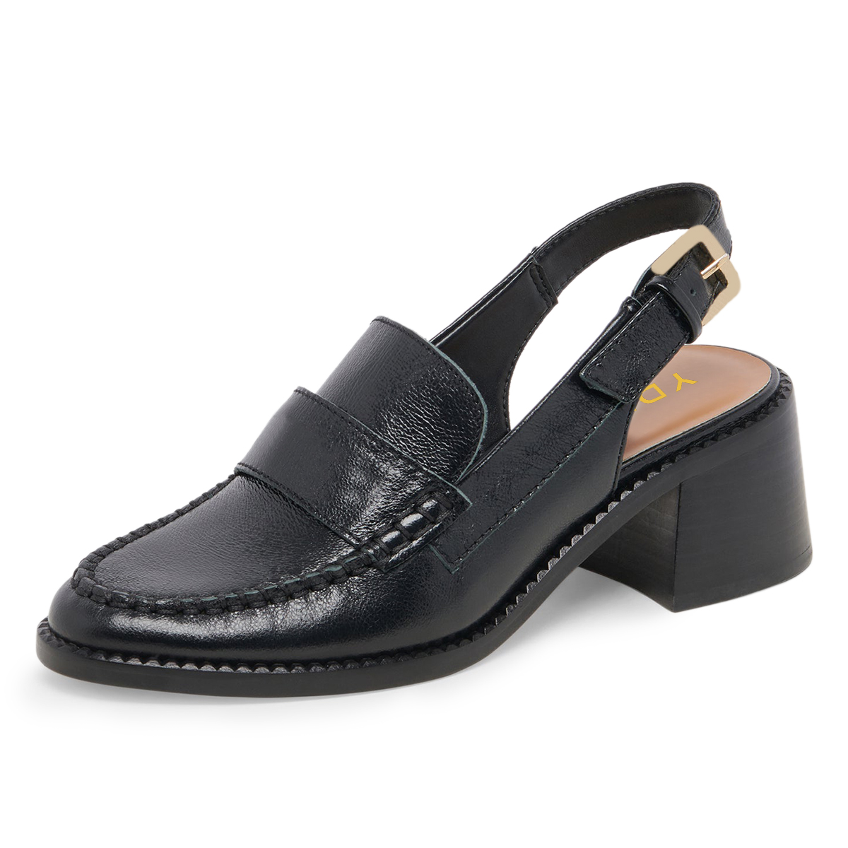• Special Designs: Black loafers with classic block heel and an adjustable slingback design.