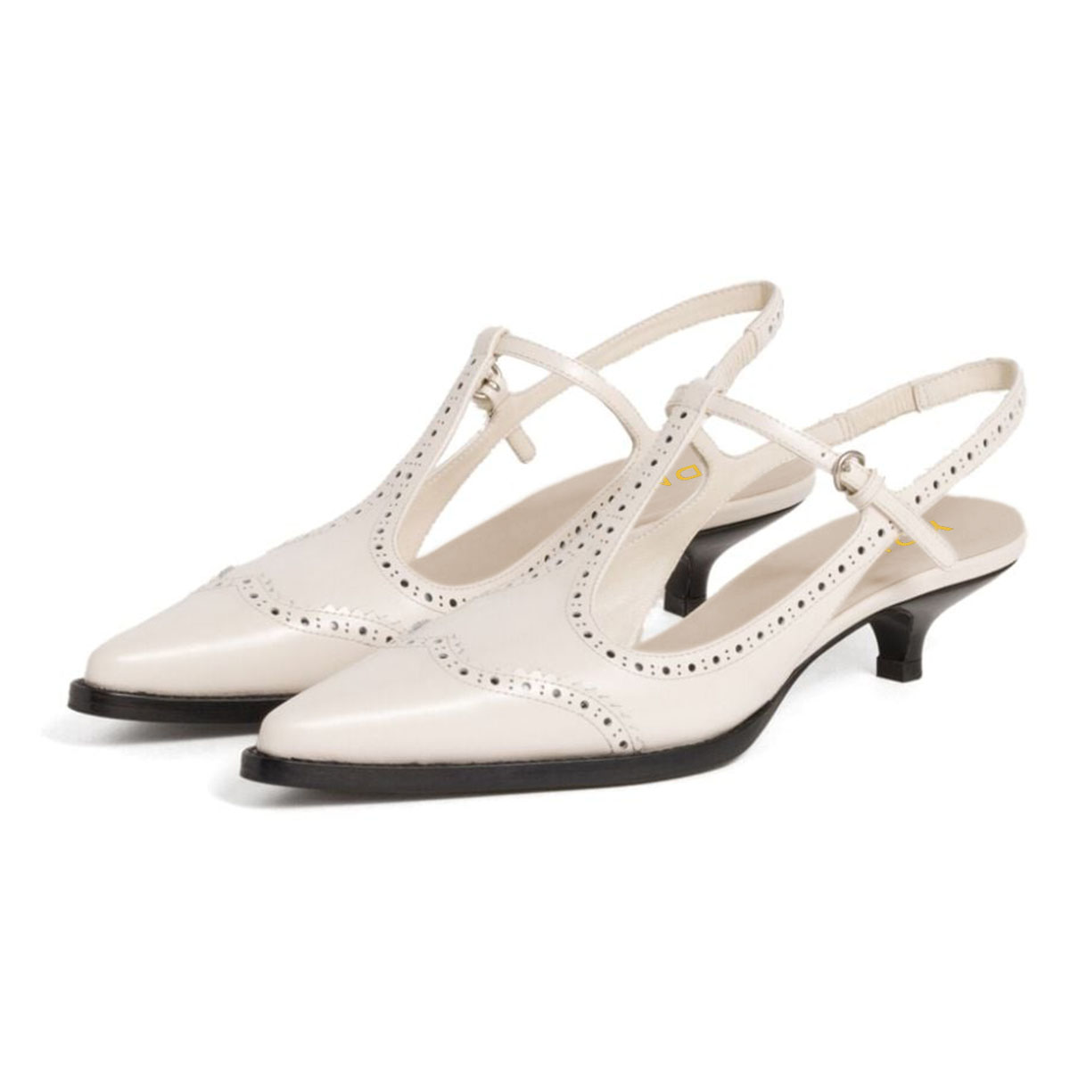 Special Designs: The pointed-toe slingback heels feature kitten heels and a buckled T-strap.