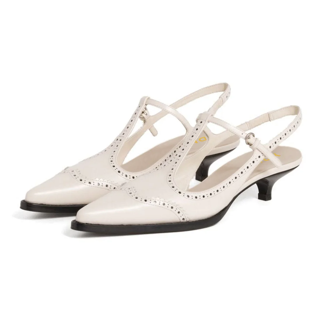 Vegan Leather Buckle Strap Pointed Toe Slingback Heels in Ivory