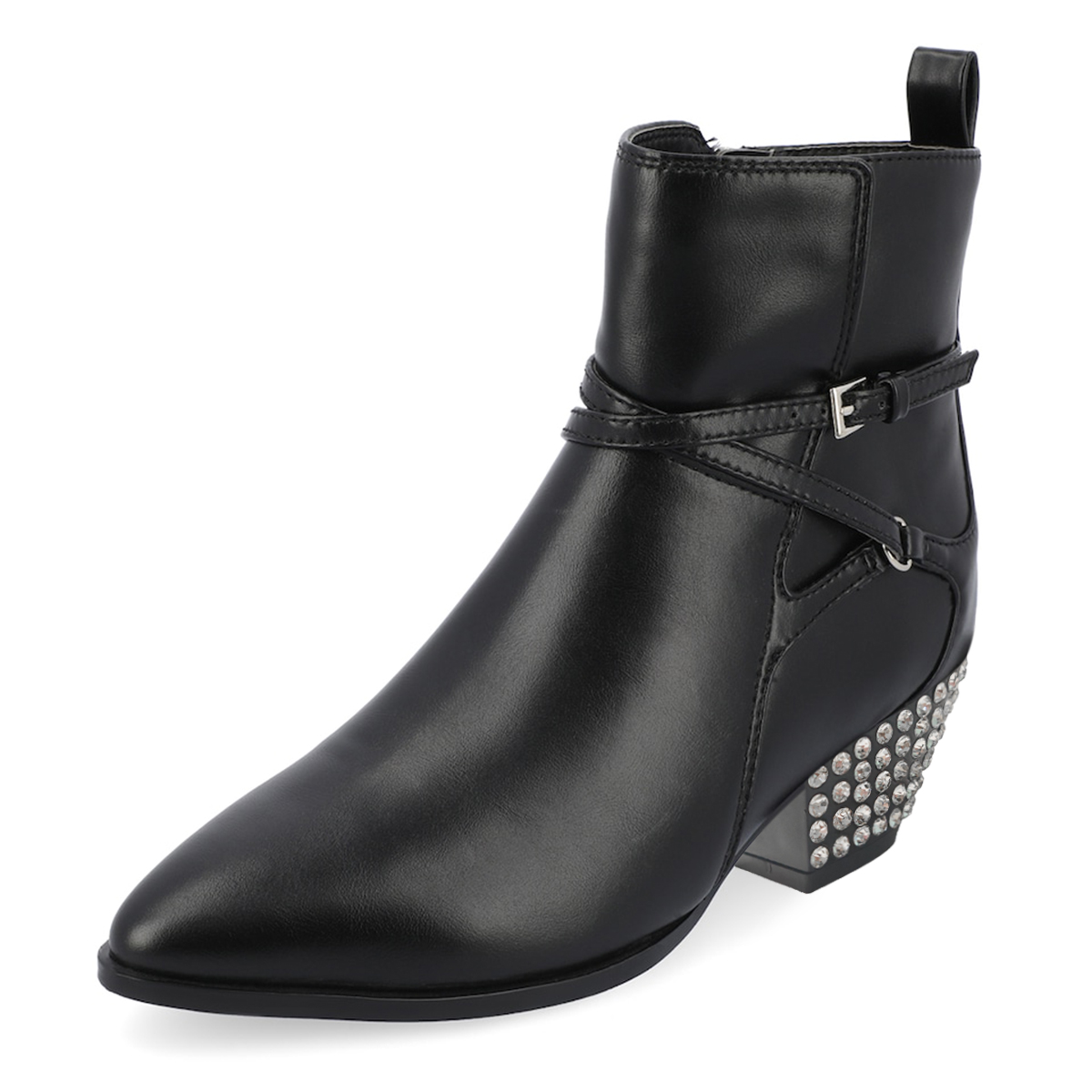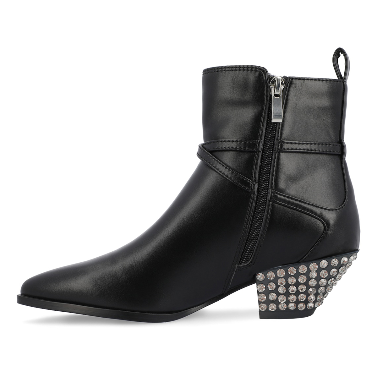 • Special Designs: Black ankle boots with a sparkling rhinestone embellished block heel and side-zip closure.