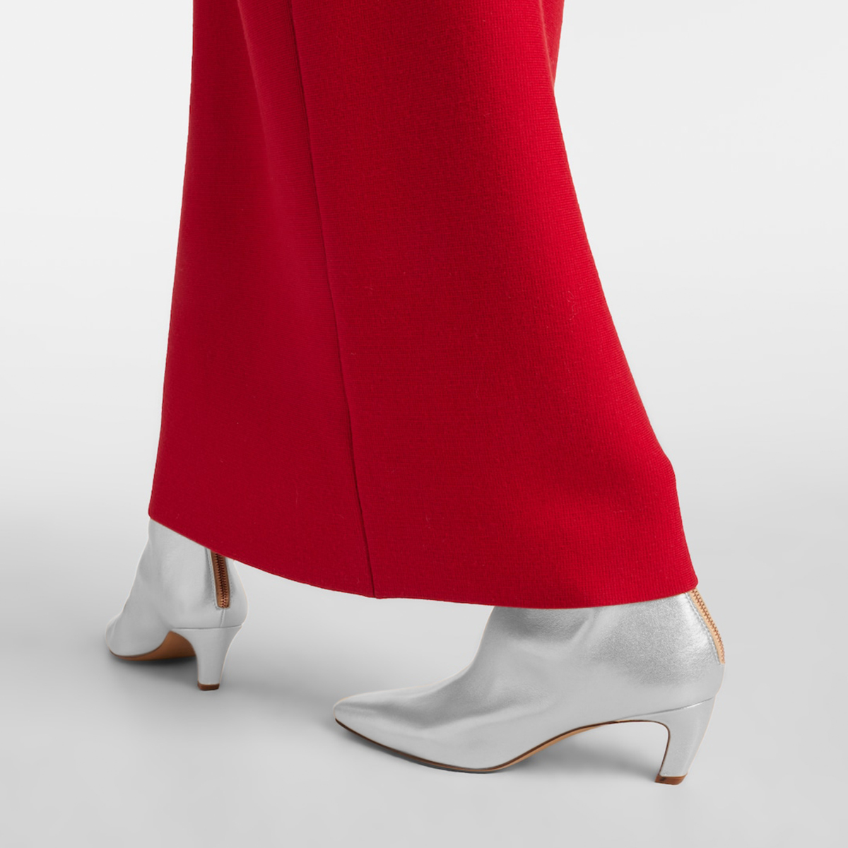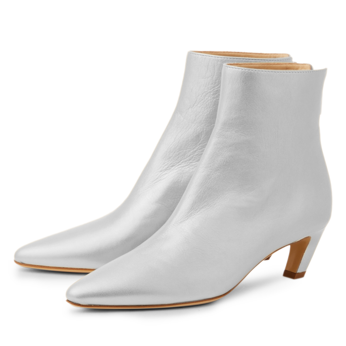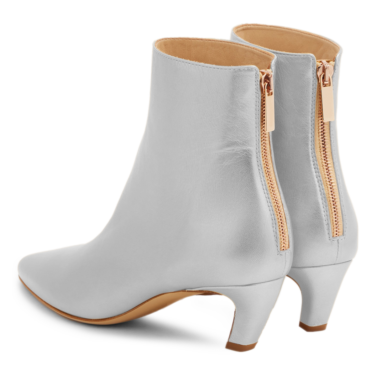 Special Designs: Silver booties with classic kitten heel and back-zip closure.