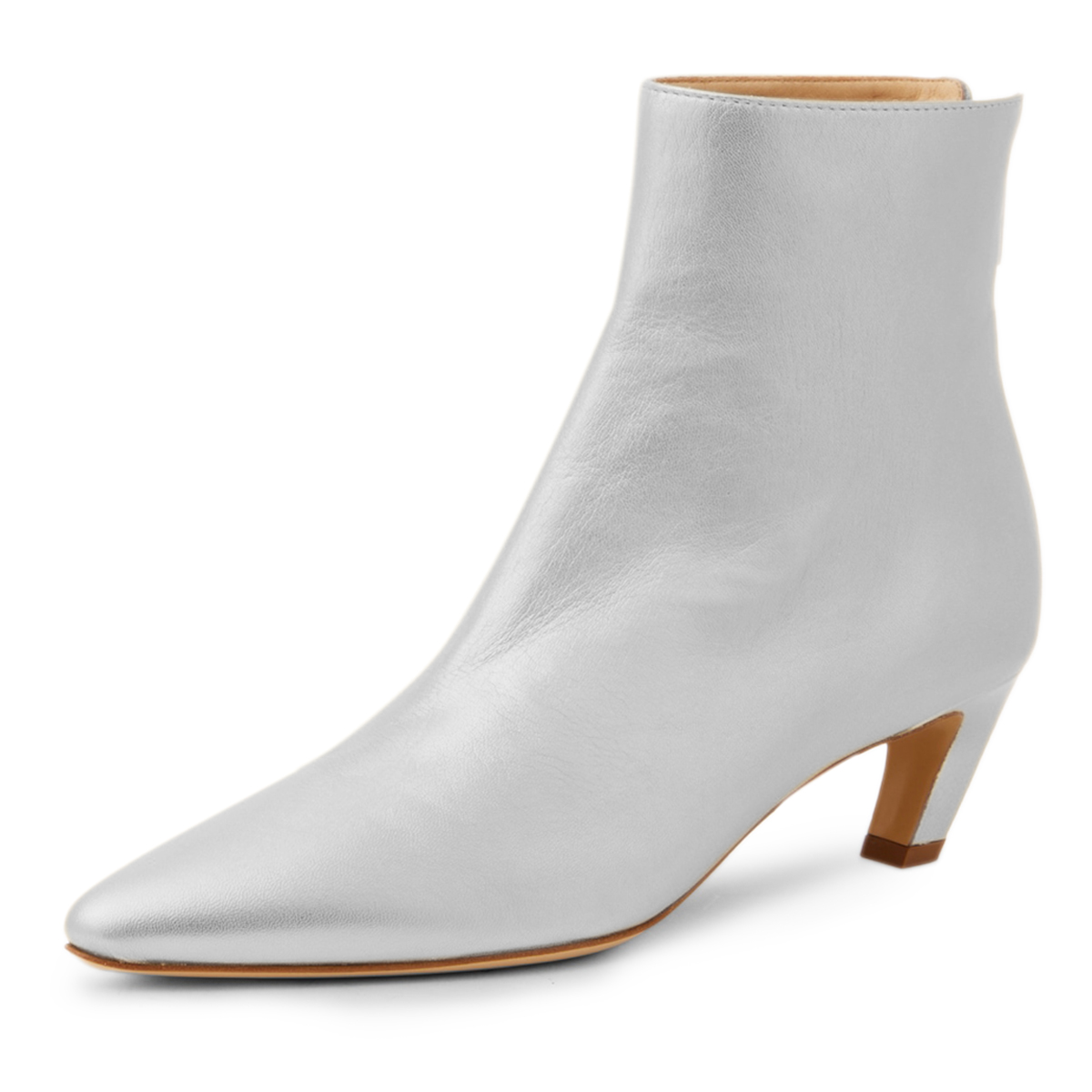 Vegan Leather Pointed Toe Back-Zip Kitten Heel Ankle Boots in Silver