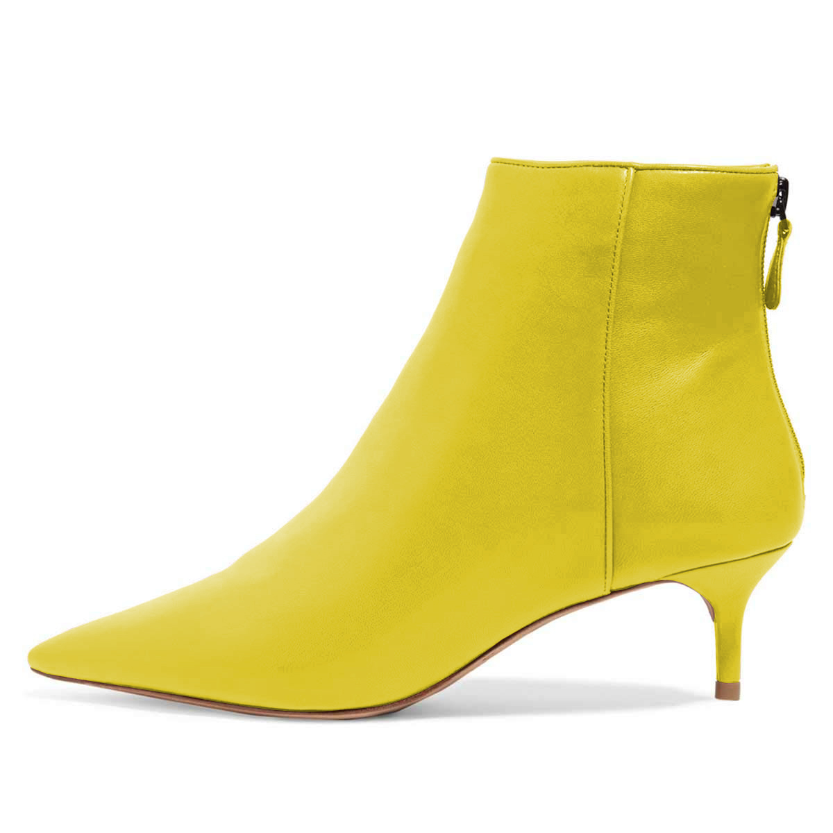 Vegan Leather Pointed Toe Back-Zip Kitten Heel Ankle Boots in Yellow