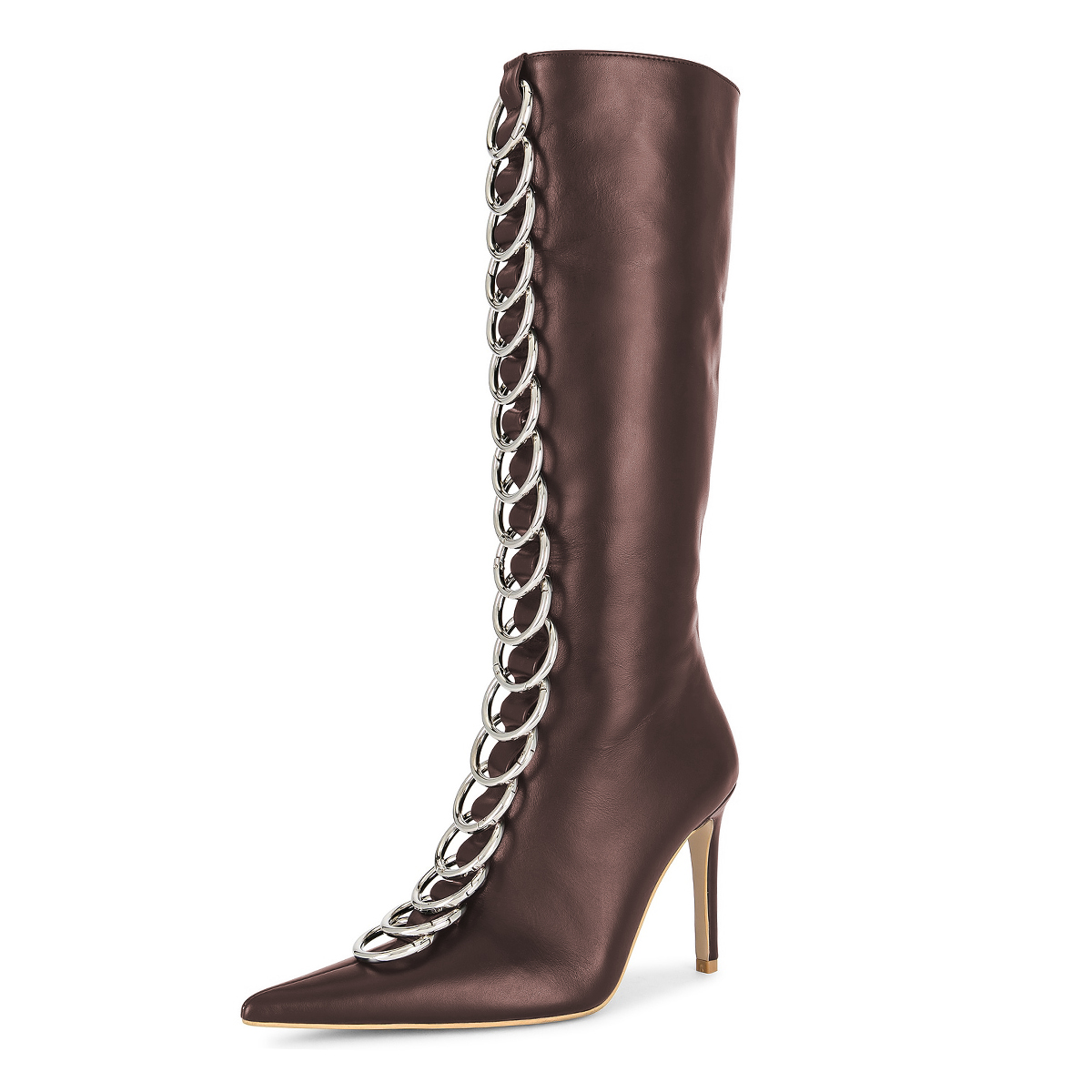 Vegan Leather Pointed Toe Silver Ring Decor Brown Knee-High Boots