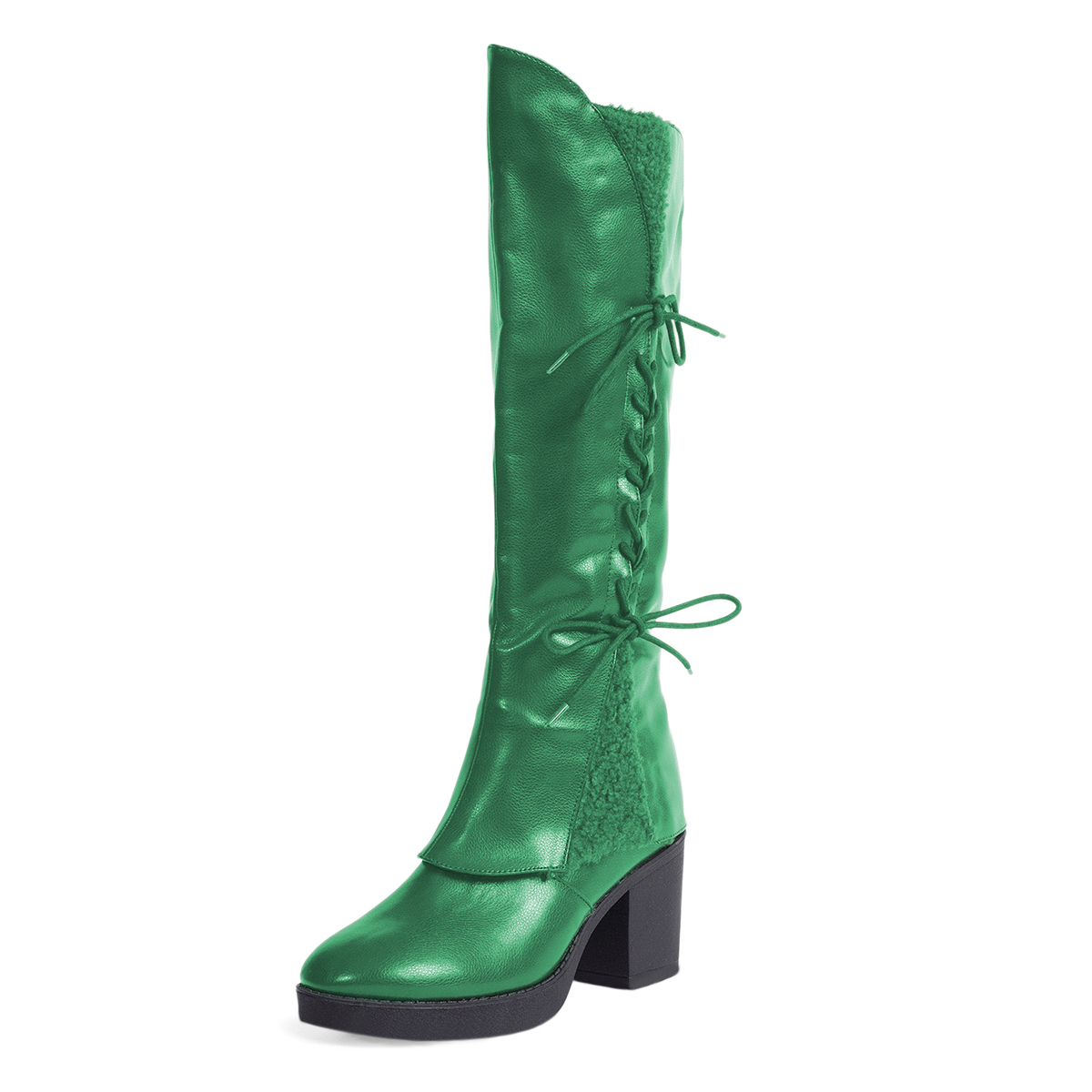 Special Designs: The green knee-high boots feature a round toe, lace-up design and a classic block heel
