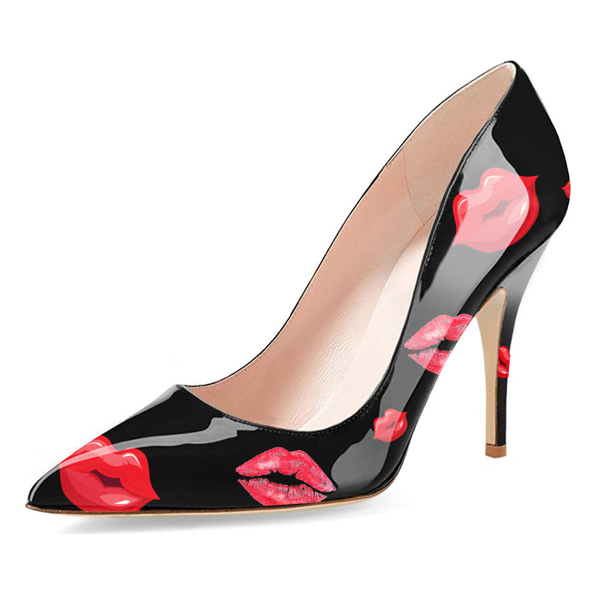 • Special Designs: Black pumps with red lips printed patent leather sophistication and a classic stiletto heel