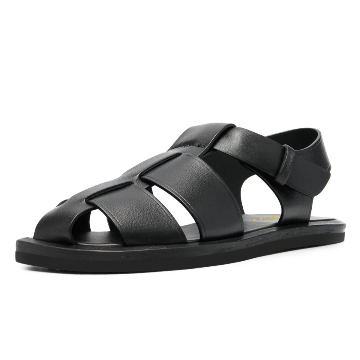 • Special Designs: Black vegan leather sophisticated cage flat strappy sandals.