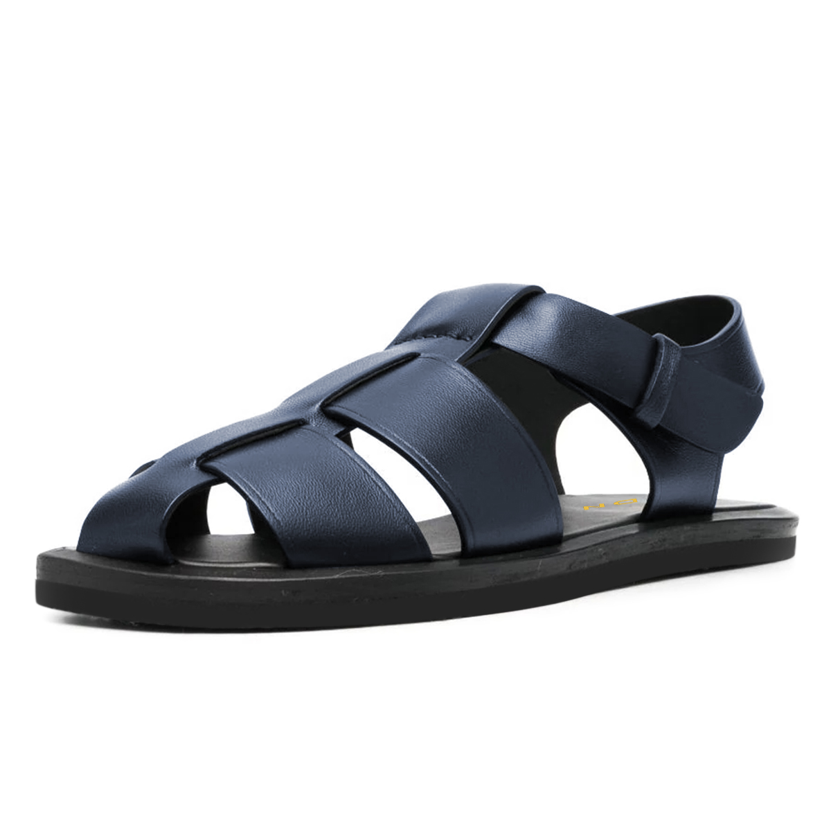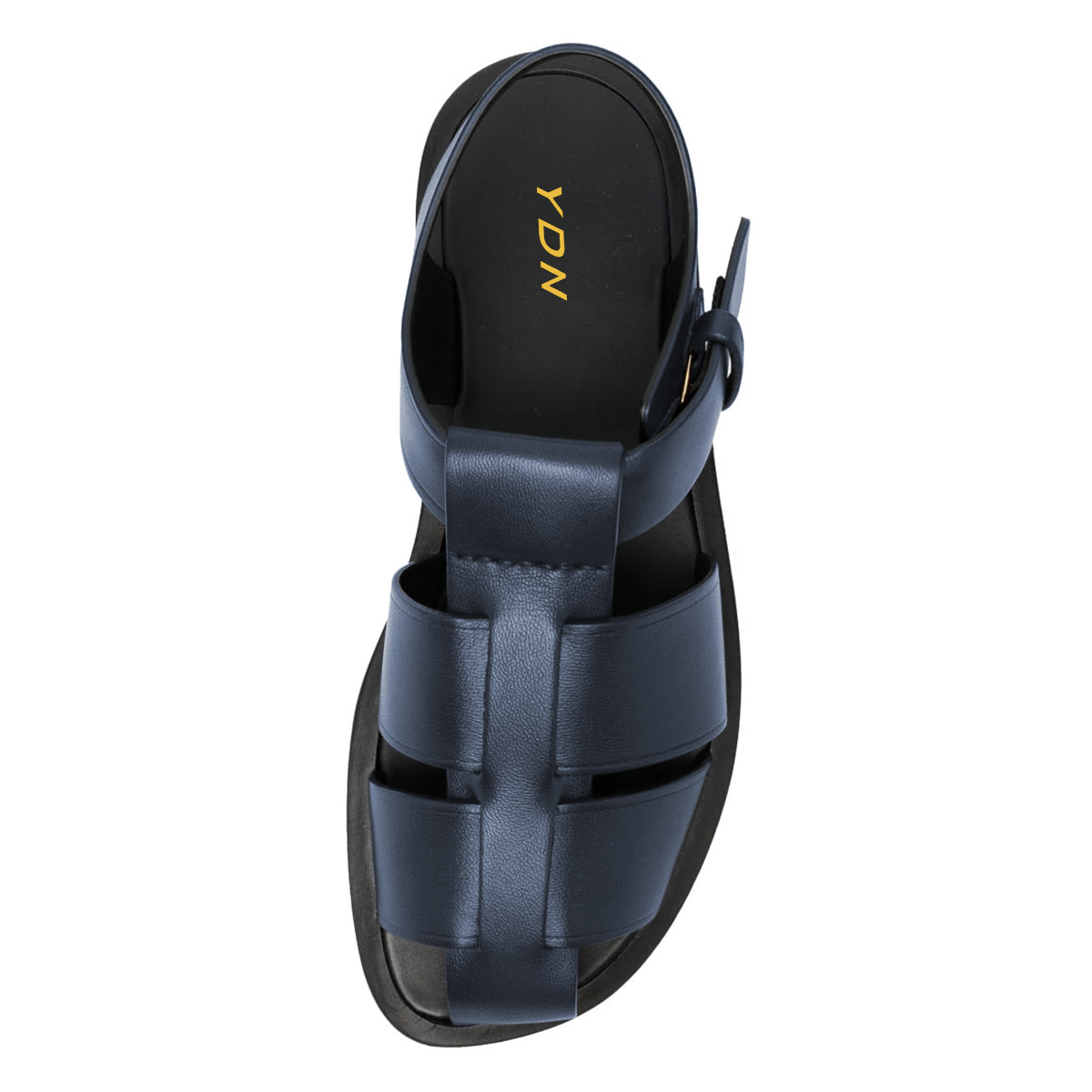 Vegan Leather Round-Toe Cage Comfy Flat Sandals in Navy