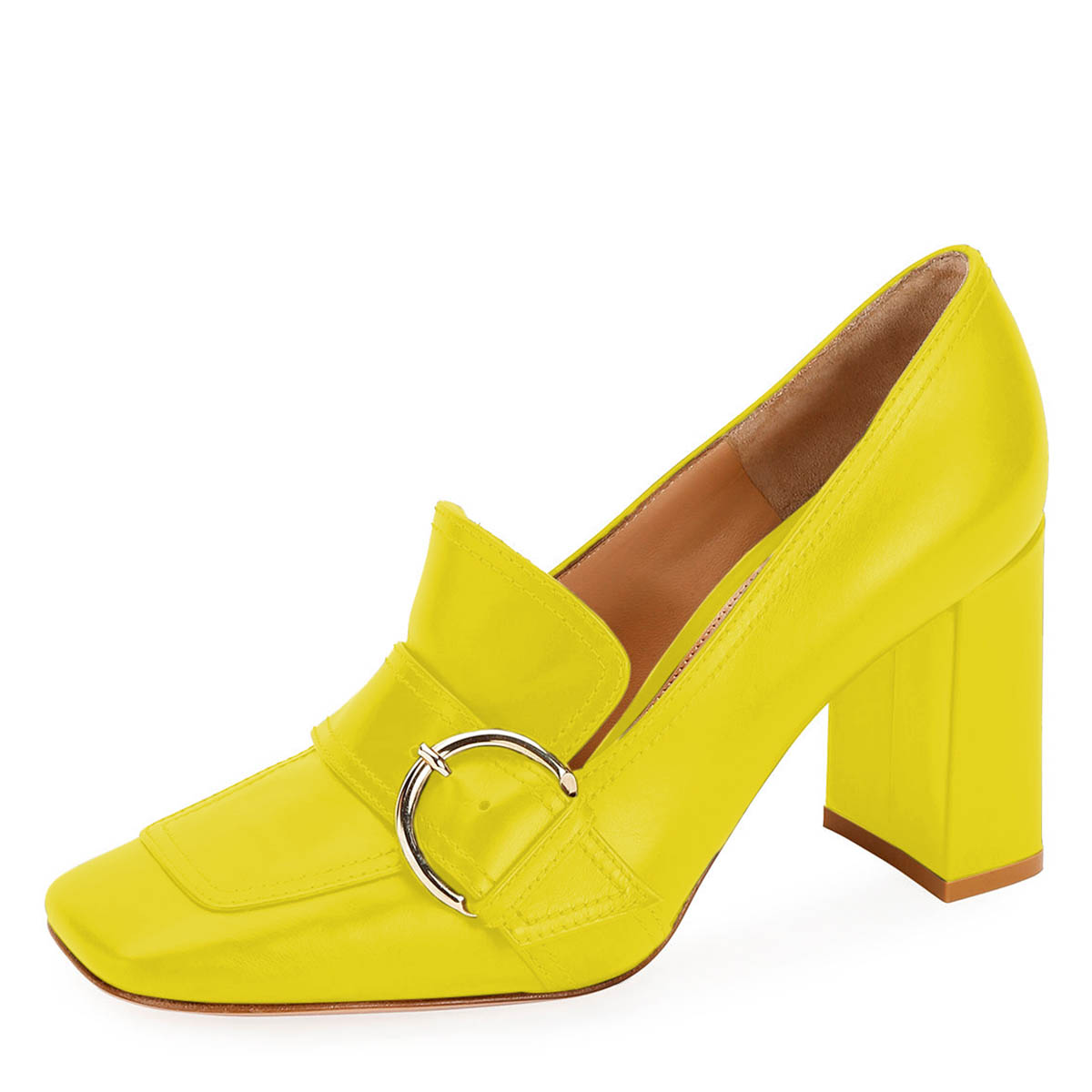 Vegan Leather Square Toe Buckle Chunky Heel Women's Loafers in Yellow