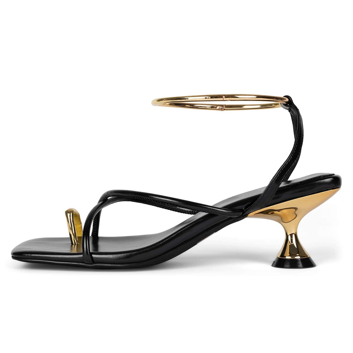 Special Designs: Black sandals feature a golden metallic toe-ring and ankle band with elegant kitten heel.