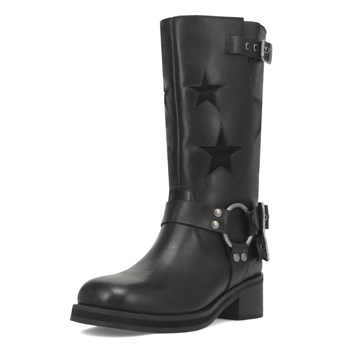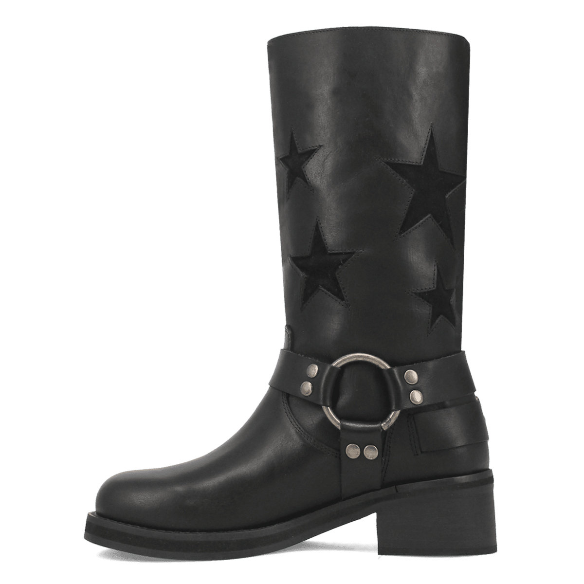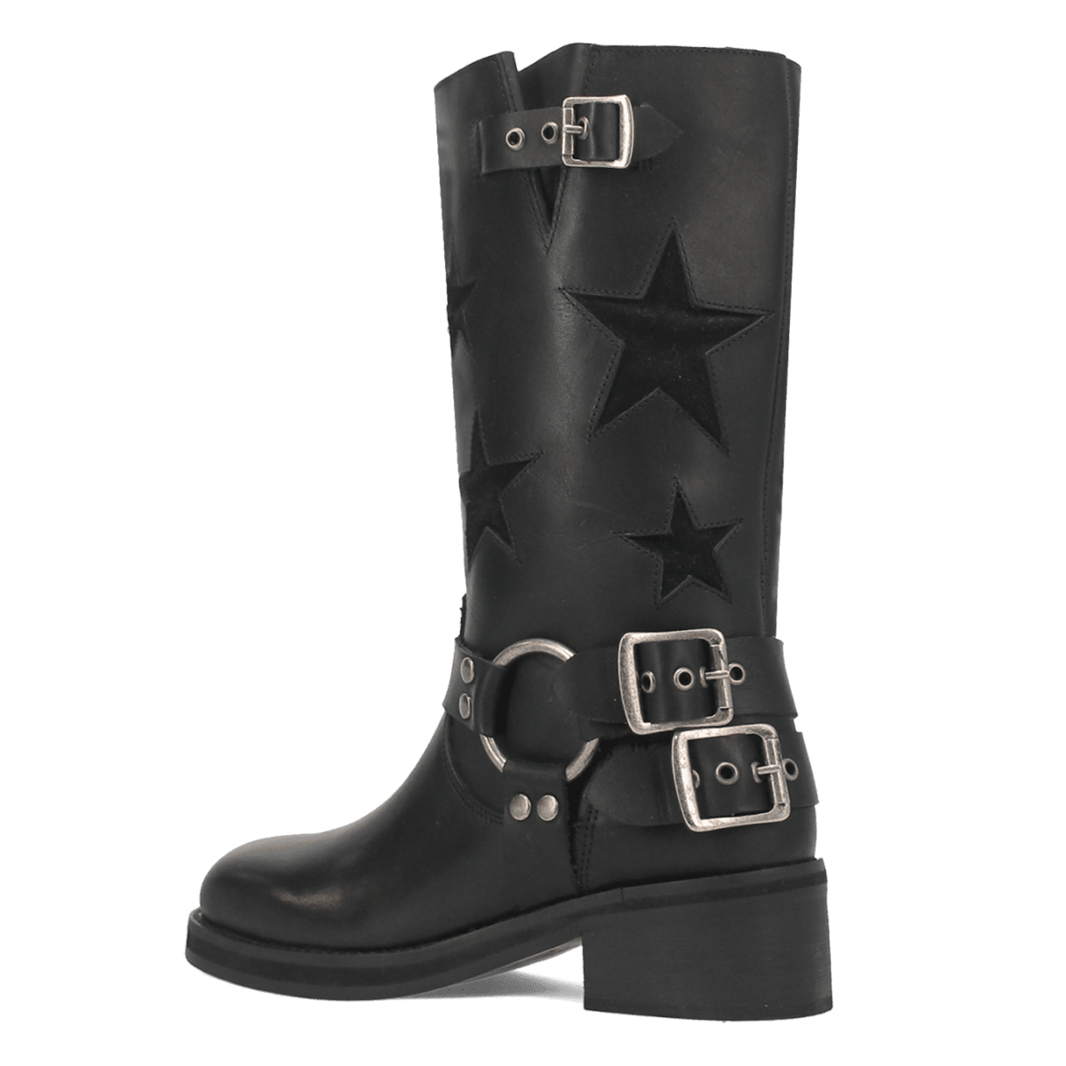 Special Designs: Black boots with classic block heel, star design and stud embellishment.