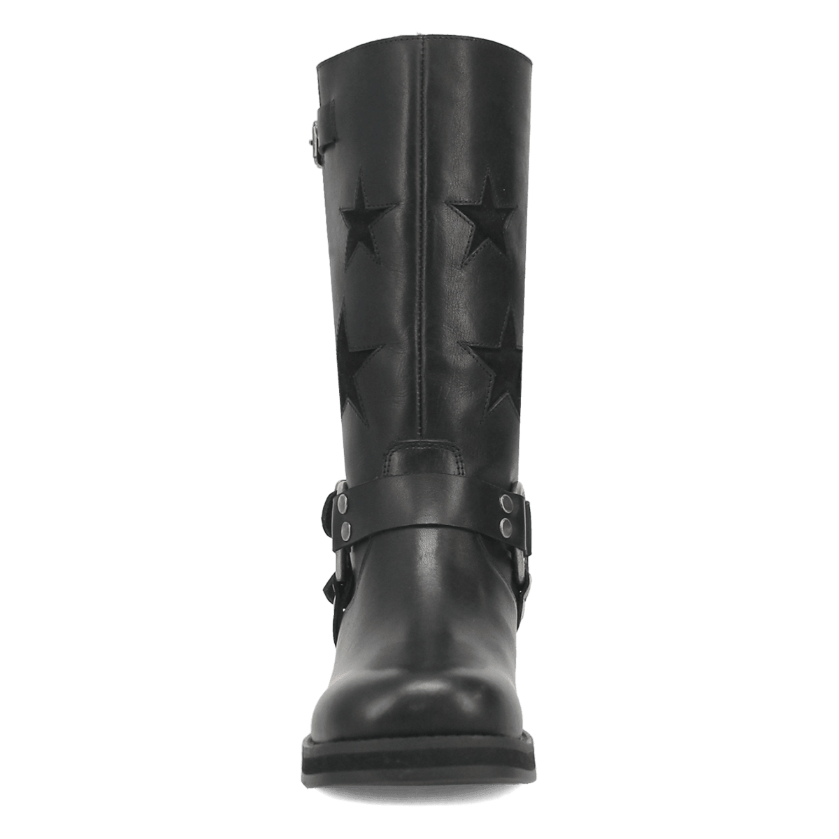 Vegan Leather Star Inlay Studded Buckle Strap Block Heel Black Boots