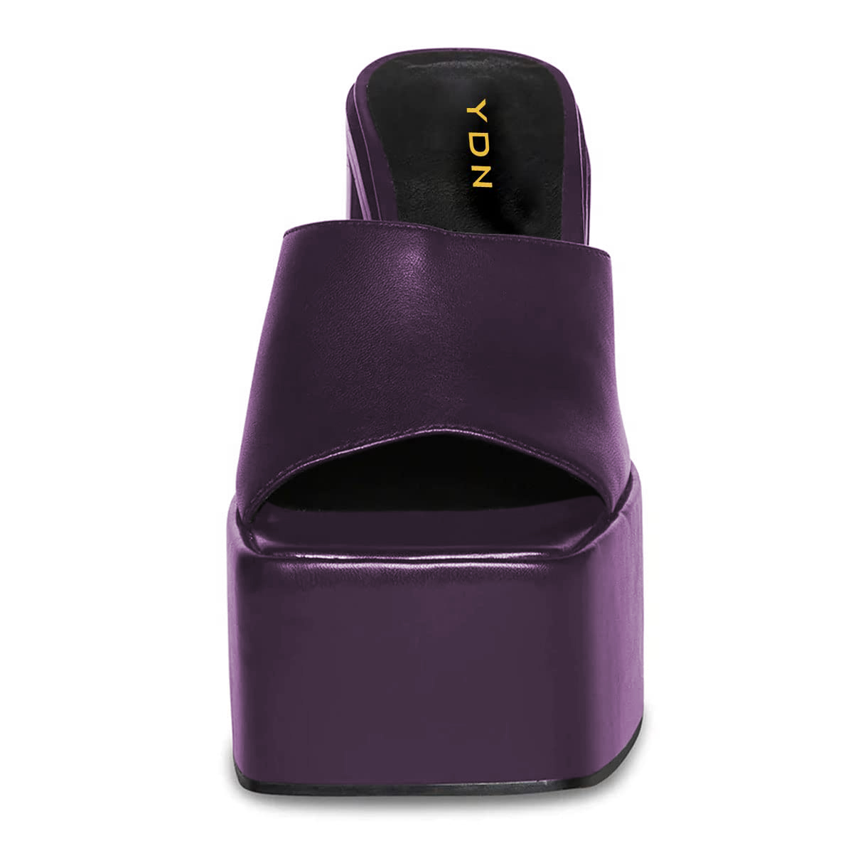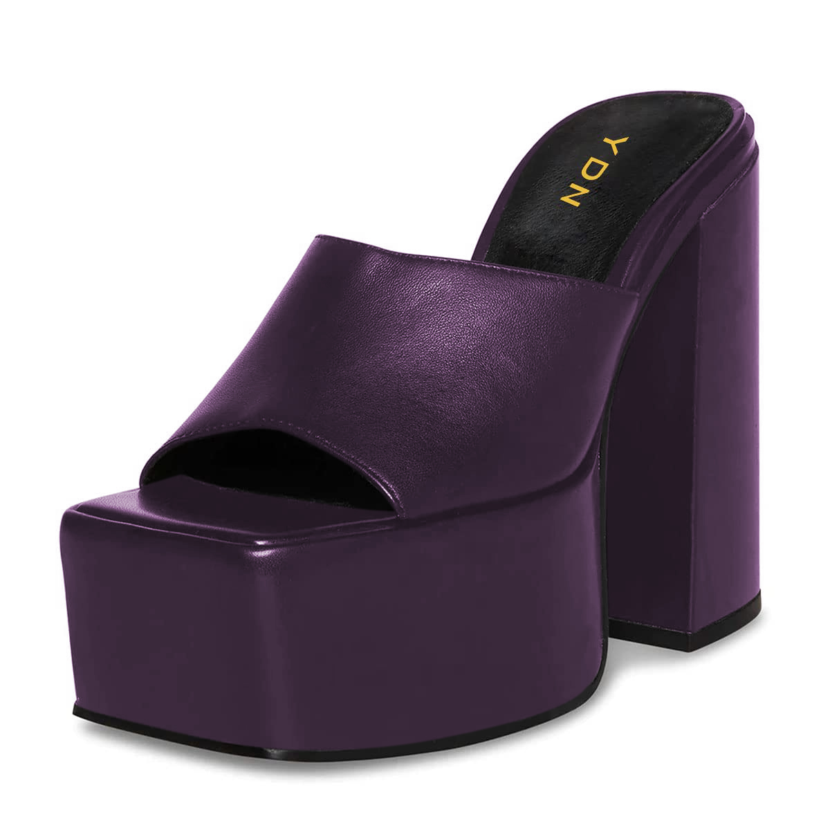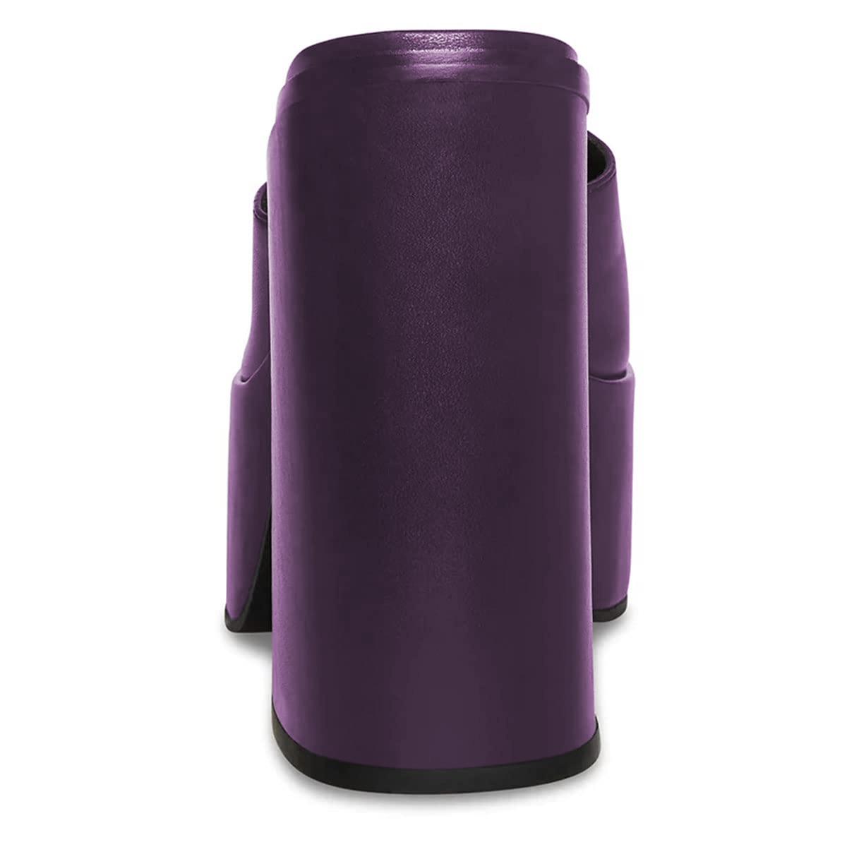 • Special Designs: Purple mules feature a bold platform, wide band design and an elegant high heel.