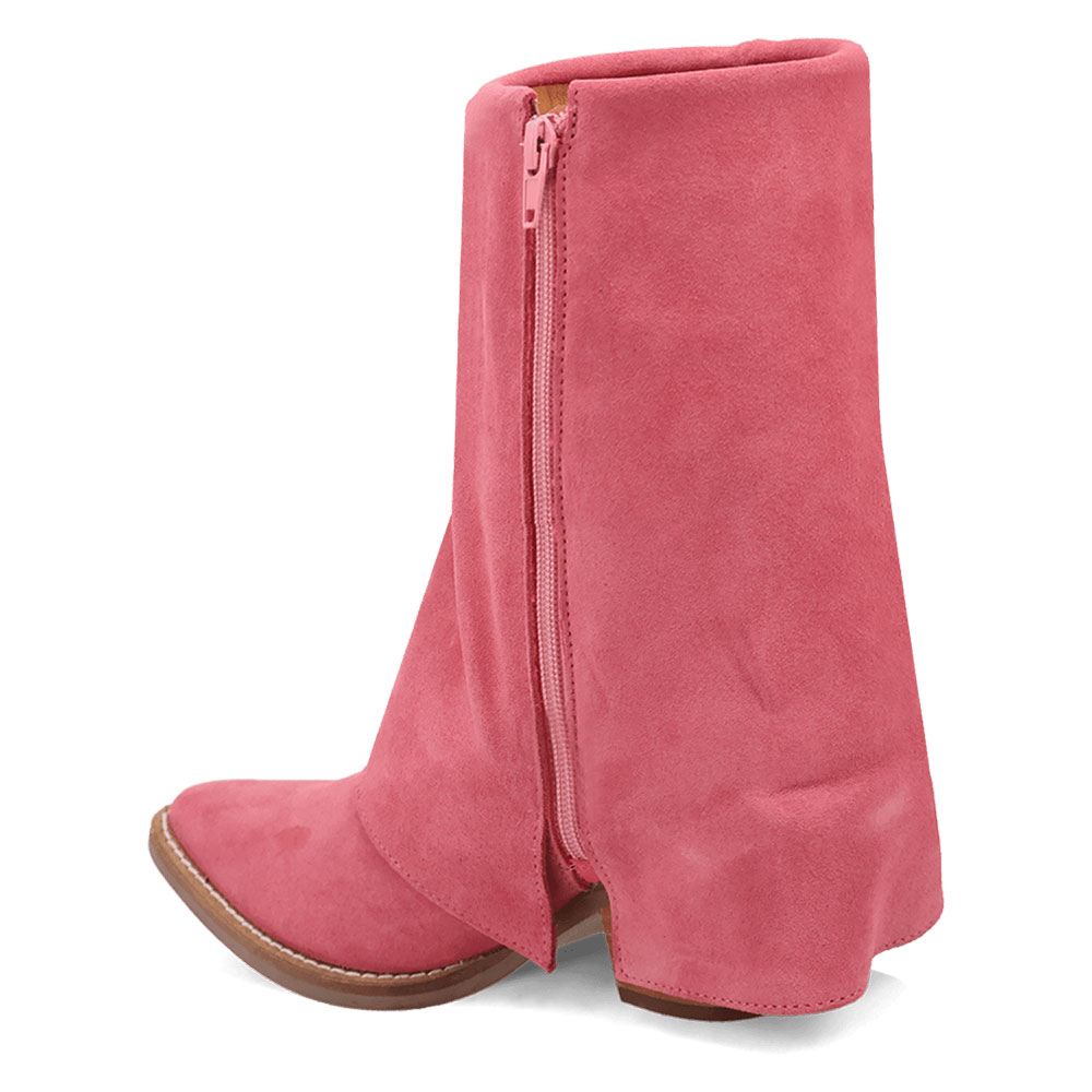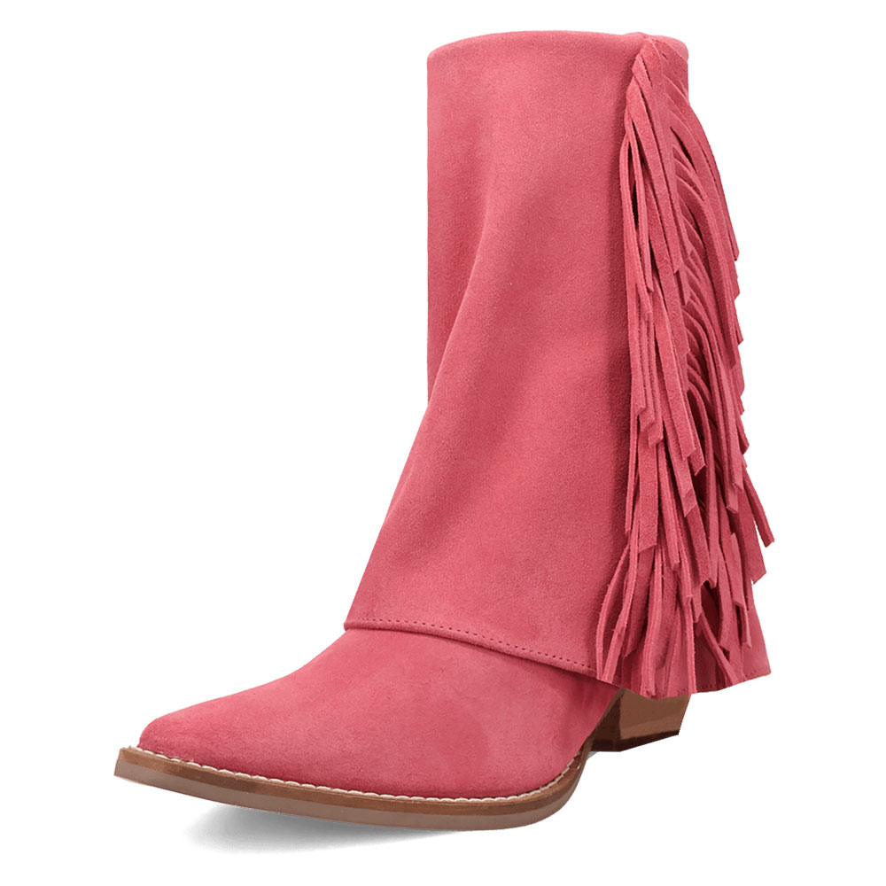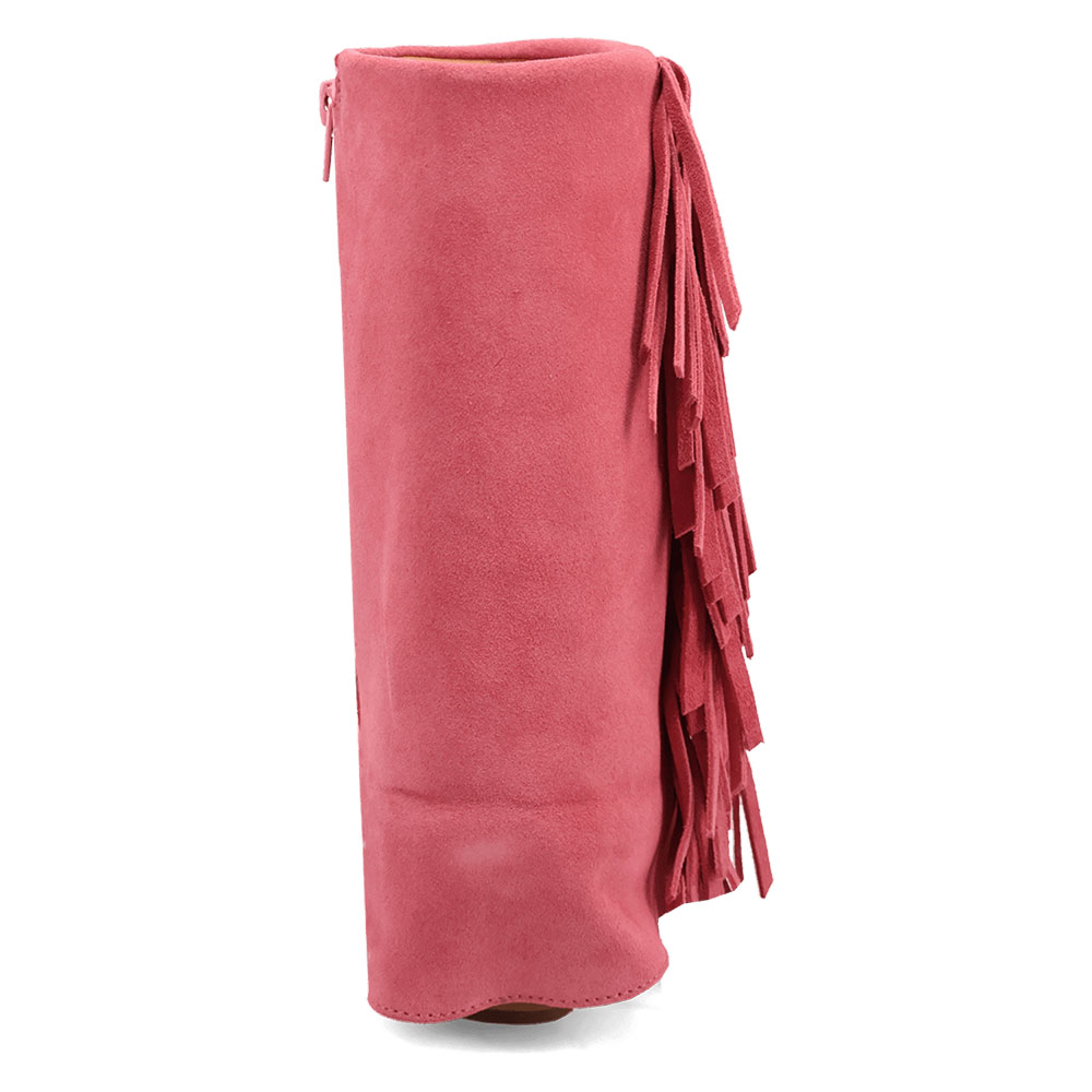 Vegan Suede Chunky Heel Almond Toe Fringe Cowgirl Boots in Pink