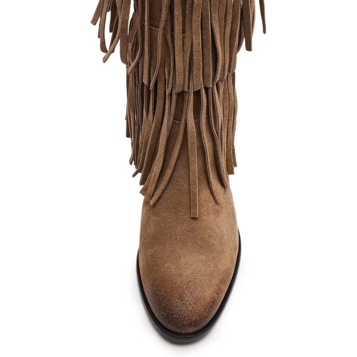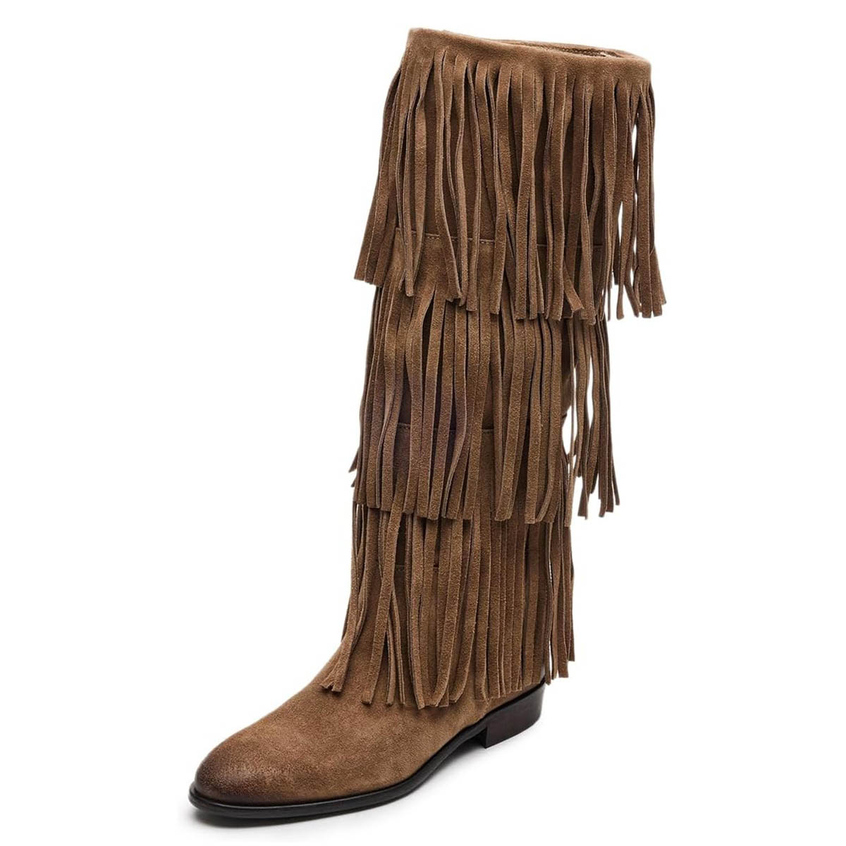 Vegan Suede Closed Toe Fringe Mid-Calf Women's Flat Boots in Khaki