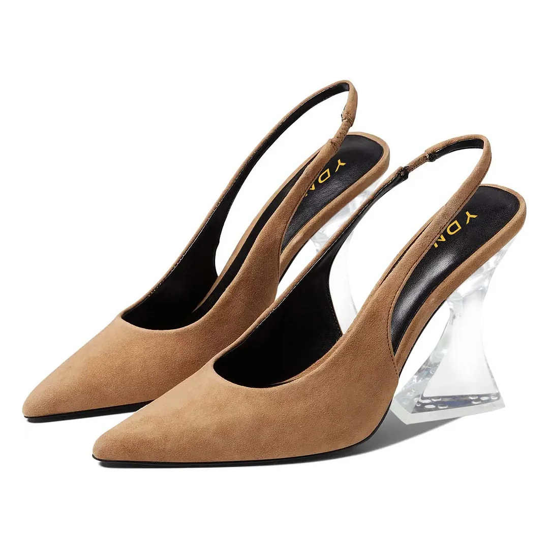 • Special Designs: The pointed-toe slingback pumps feature a transparent flared heel.