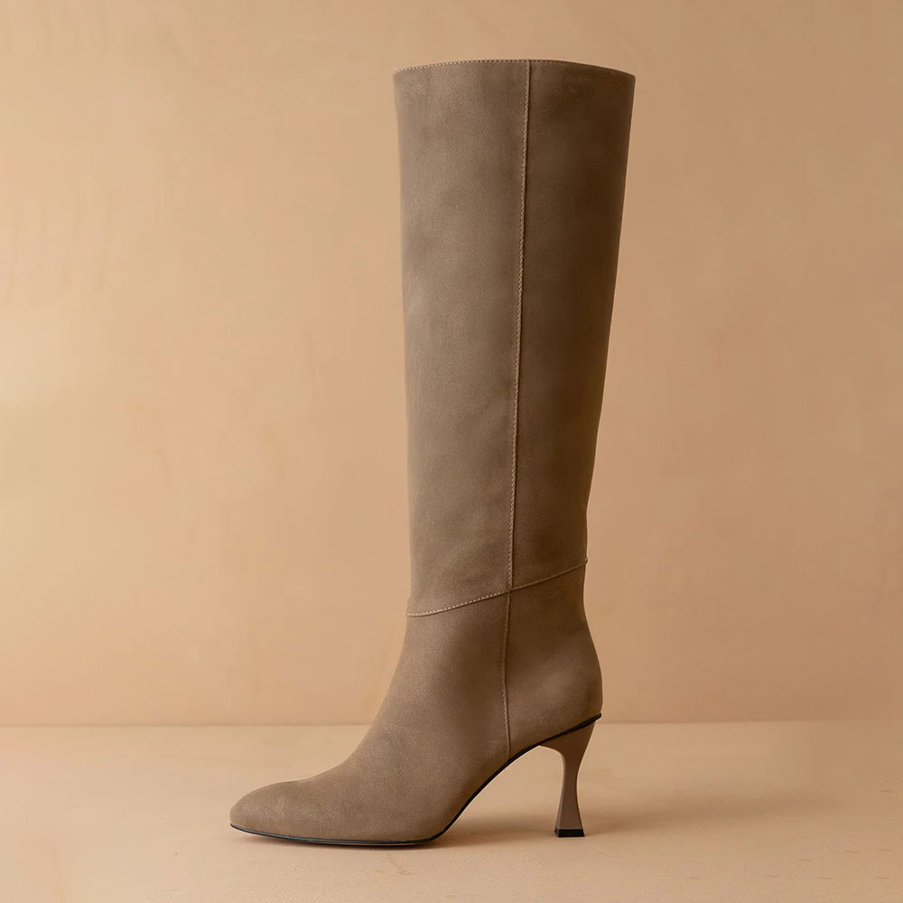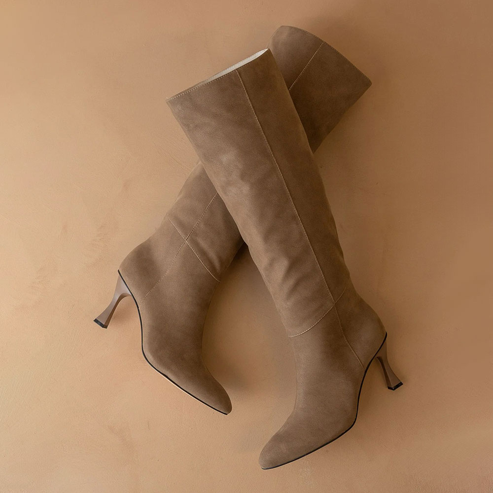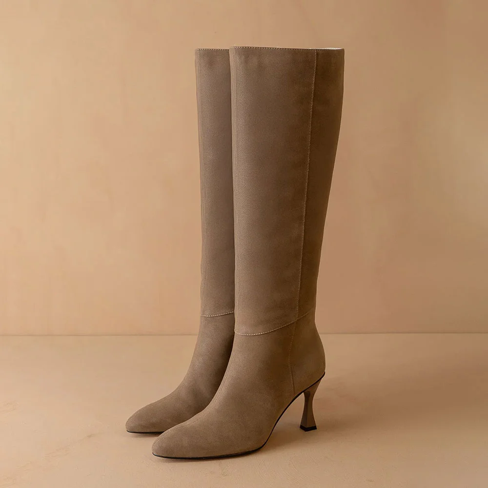 Vegan Suede Pointed Toe Flared Heel Tall Boots for Women in Dark Taupe