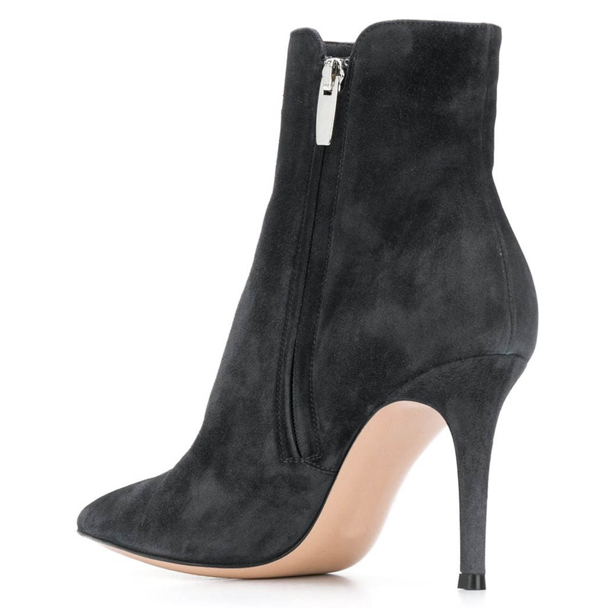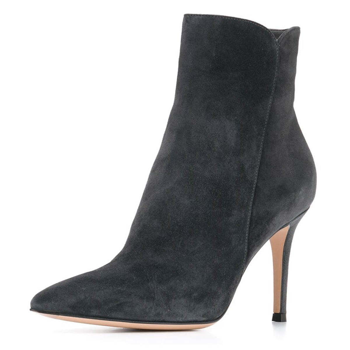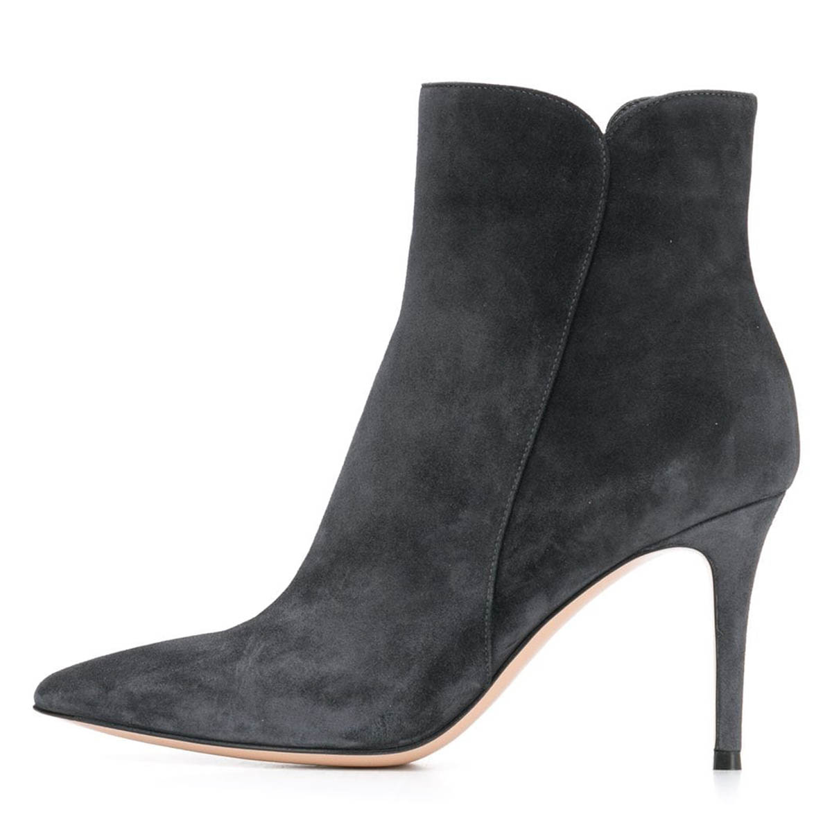 Vegan Suede Pointed Toe Side Zipper Stiletto Heel Boots in Dark Grey