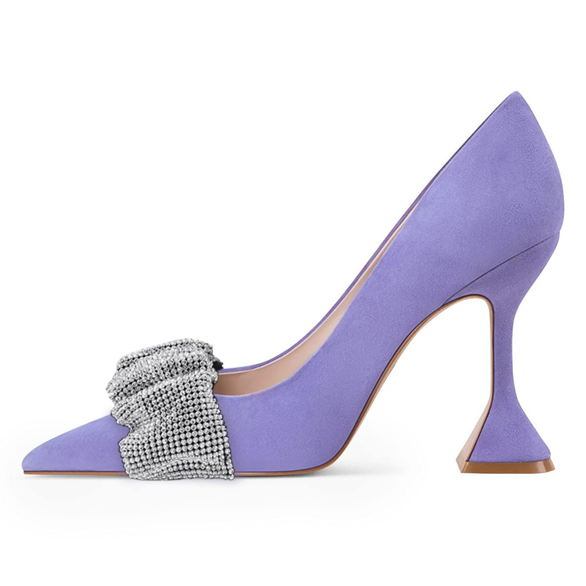 • Special Designs: Purple pump heels feature a stylish pointed-toe, rhinestone embellishment, and flared heel design.