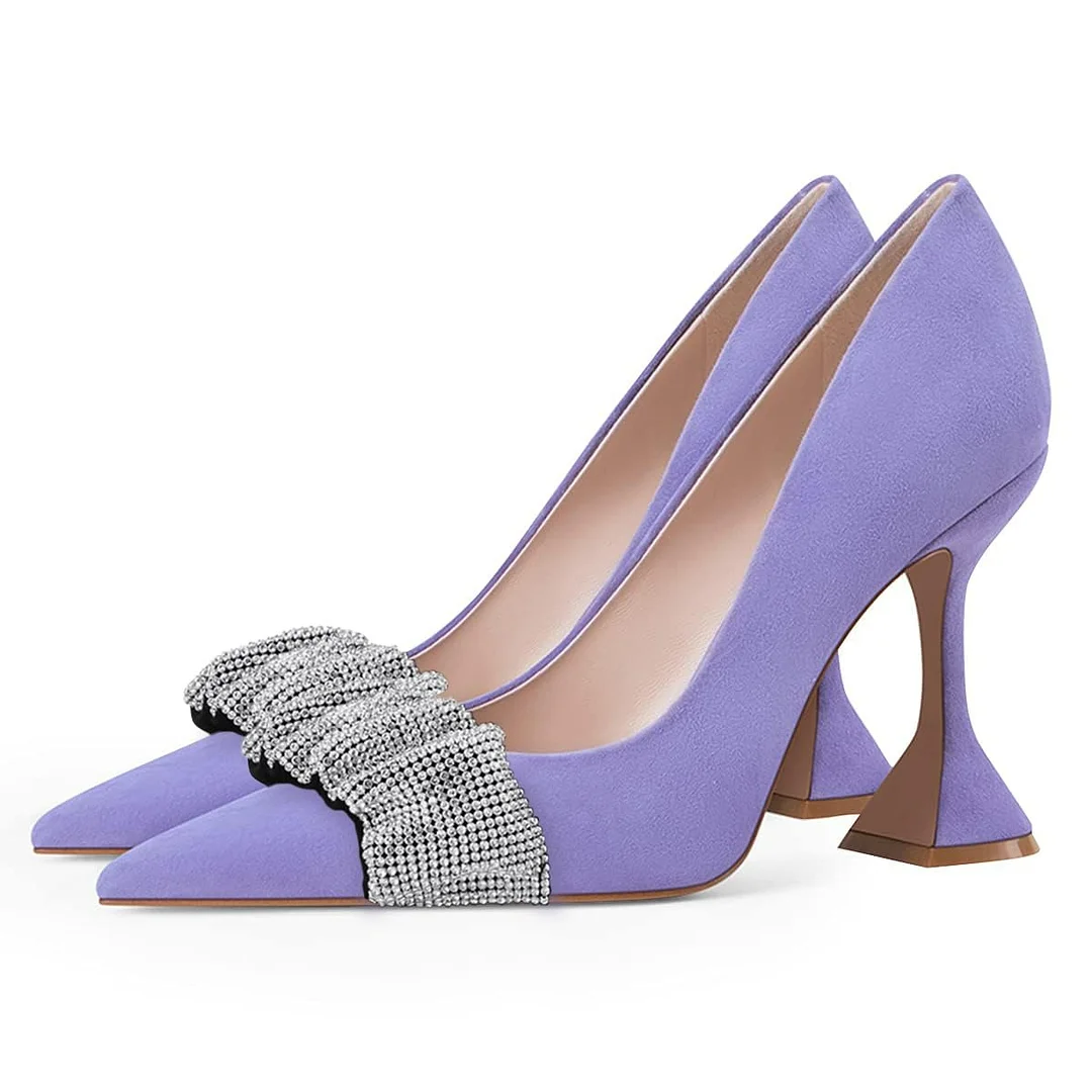 Vegan Suede Rhinestone Embellished Pointed Toe Pumps Heels in Purple