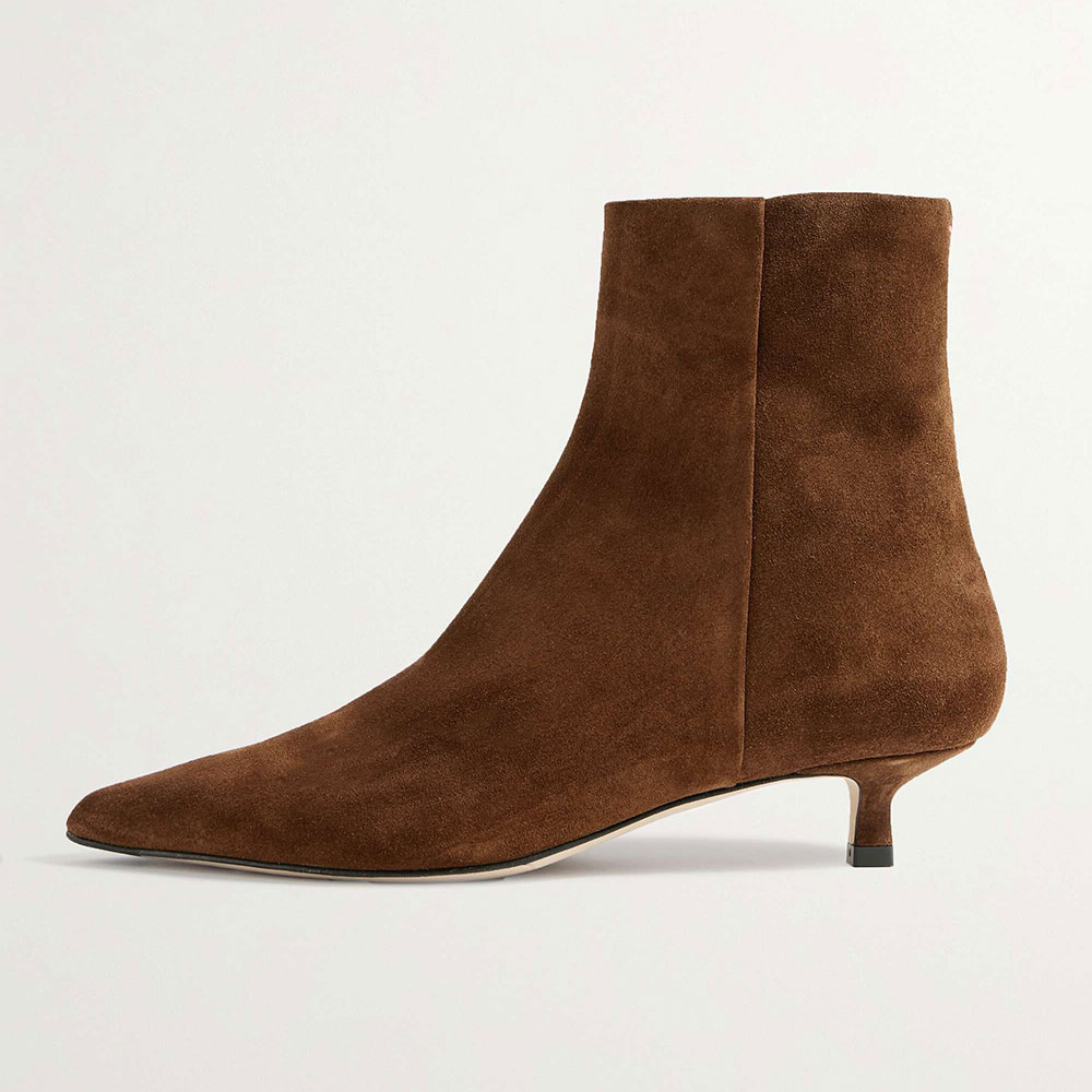 Vegan Suede Side Zipper Pointed Toe Kitten Heel Ankle Boots in Brown