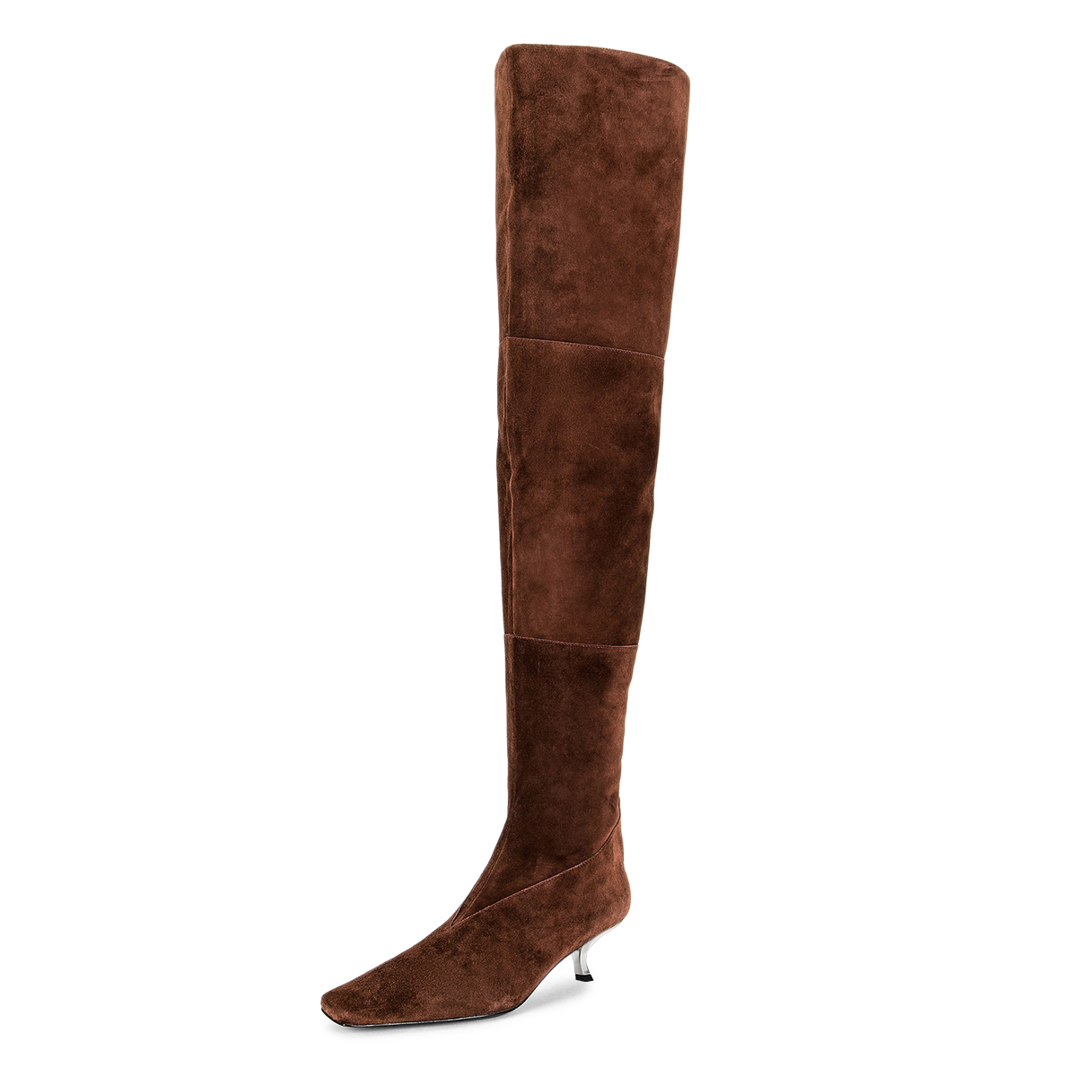 Vegan Suede Square Toe Silver Comma Heel Thigh-High Boots in Brown