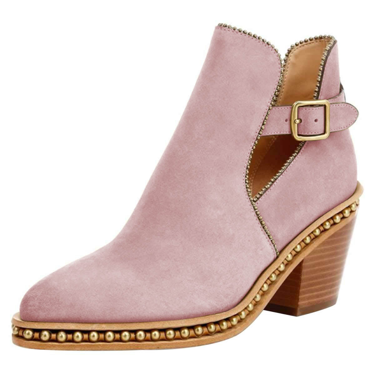 Special Designs: The pointed-toe stacked-heel ankle boots feature chic studs decorated and an adjustable buckle strap for easy wearing.
