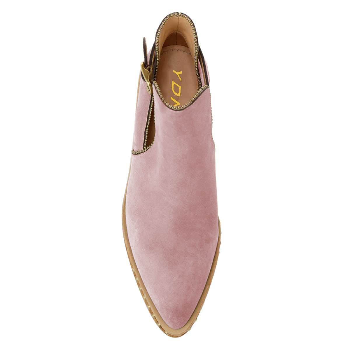 Vegan Suede Studded Stacked Heel Buckle Strap Ankle Boots in Pink
