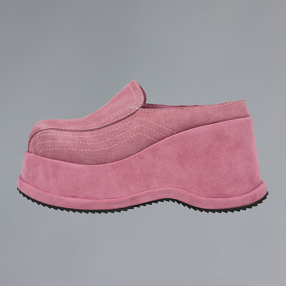 The pink mules feature a closed toe and wedge heel, a bold platform.