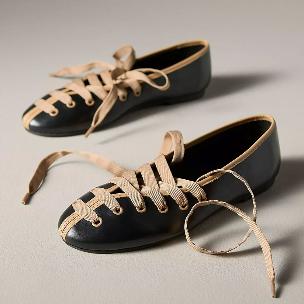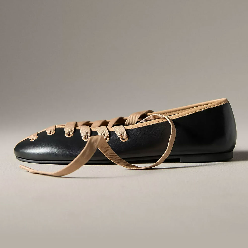 Vintage Black Round Toe Lace Up Ballet Flat Shoes for Women