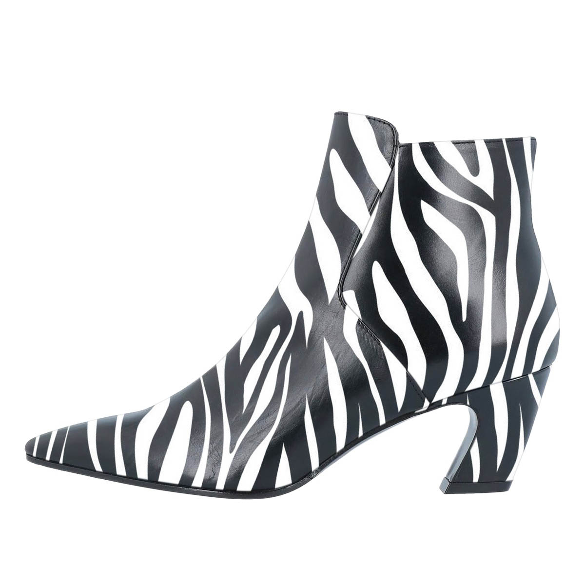 a bold zebra print, a pointed toe, a chunky low heel, and a side zipper for easy wear.